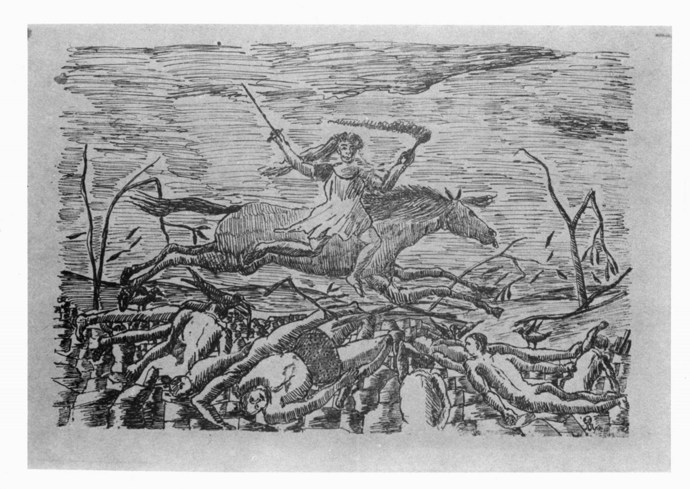 La guerre. Morte con spada e fiaccola a cavallo tra cadaveri