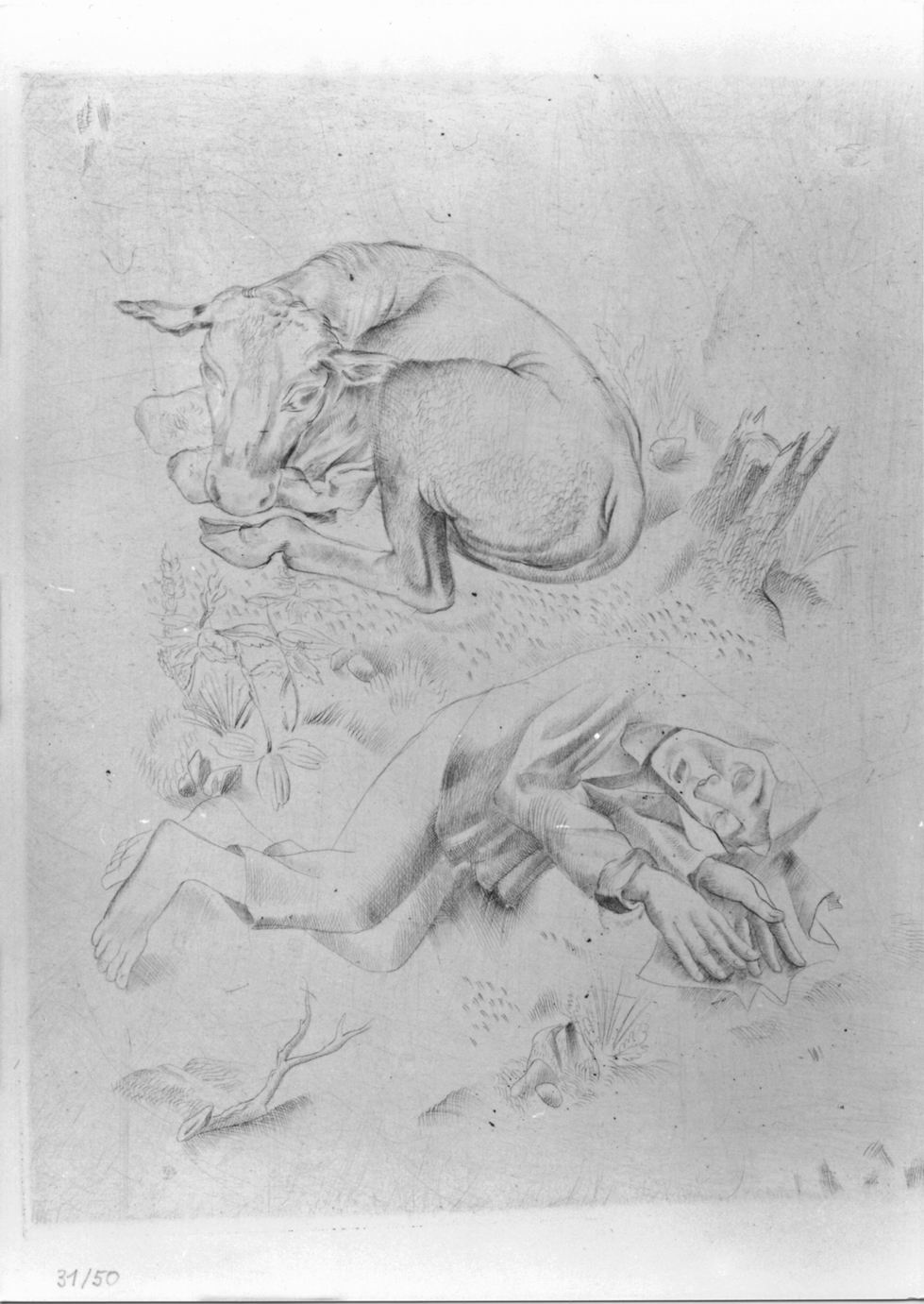 Paesaggi: paesaggio agreste. Figure maschili: pastore addormentato. Animali: vitello
