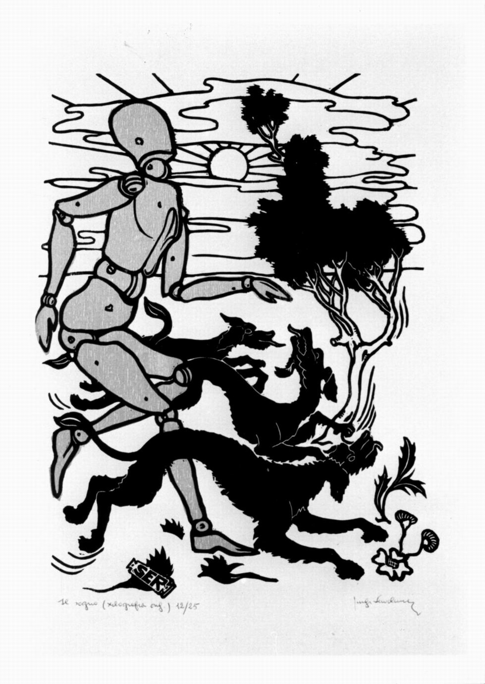 Paesaggi: paesaggio con alberi. Corpi celesti: sole. Oggetti: manichino. Animali: cani
