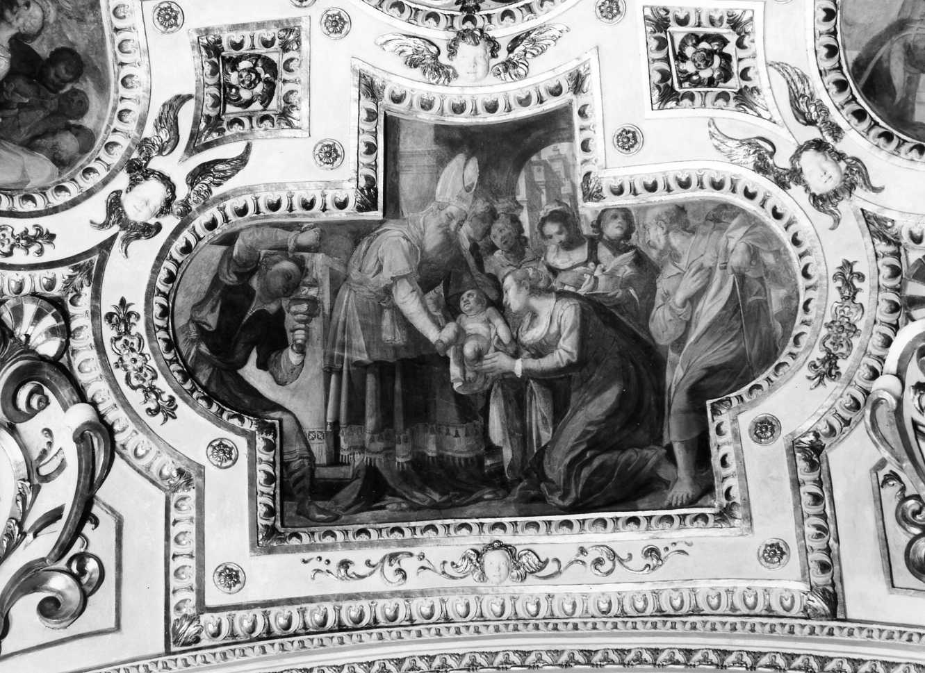 La scena si sviluppa nel centro e sulla destra dove si affollano i personaggi; sulla sinistra un giovane tiene in mano un turibolo
