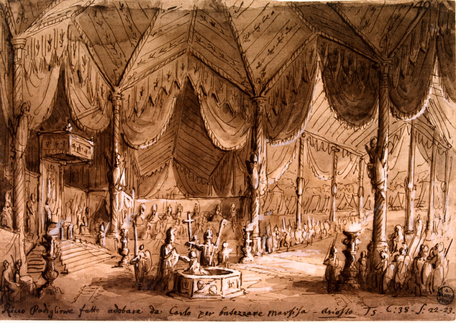 - ISCRIZIONI in basso - MARGANORE FA DARE IL BANDO ALLE DONNE DAL SUA CASTELLO - ARIOSTO T 5 C 37 S 82 - Basoli Antonio - corsivo - a penna -