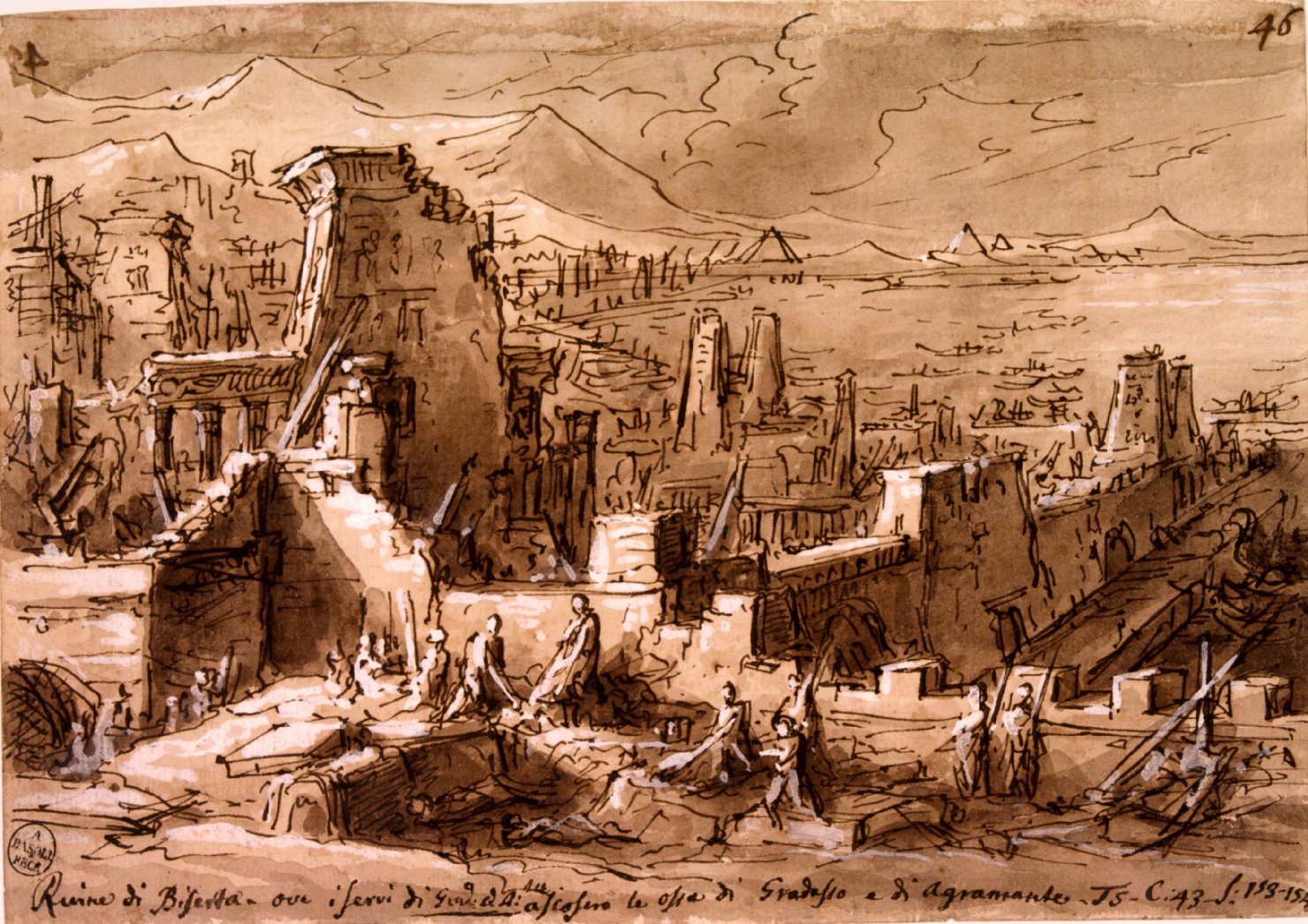 - ISCRIZIONI in basso - RINALDO E' INTRODOTTO DI NOTTE DA UN CAVAGLIERO - ENTRATA ENTRO UN PALAZZO - T 5 C 42 S 73 - Basoli Antonio - corsivo - a penna -