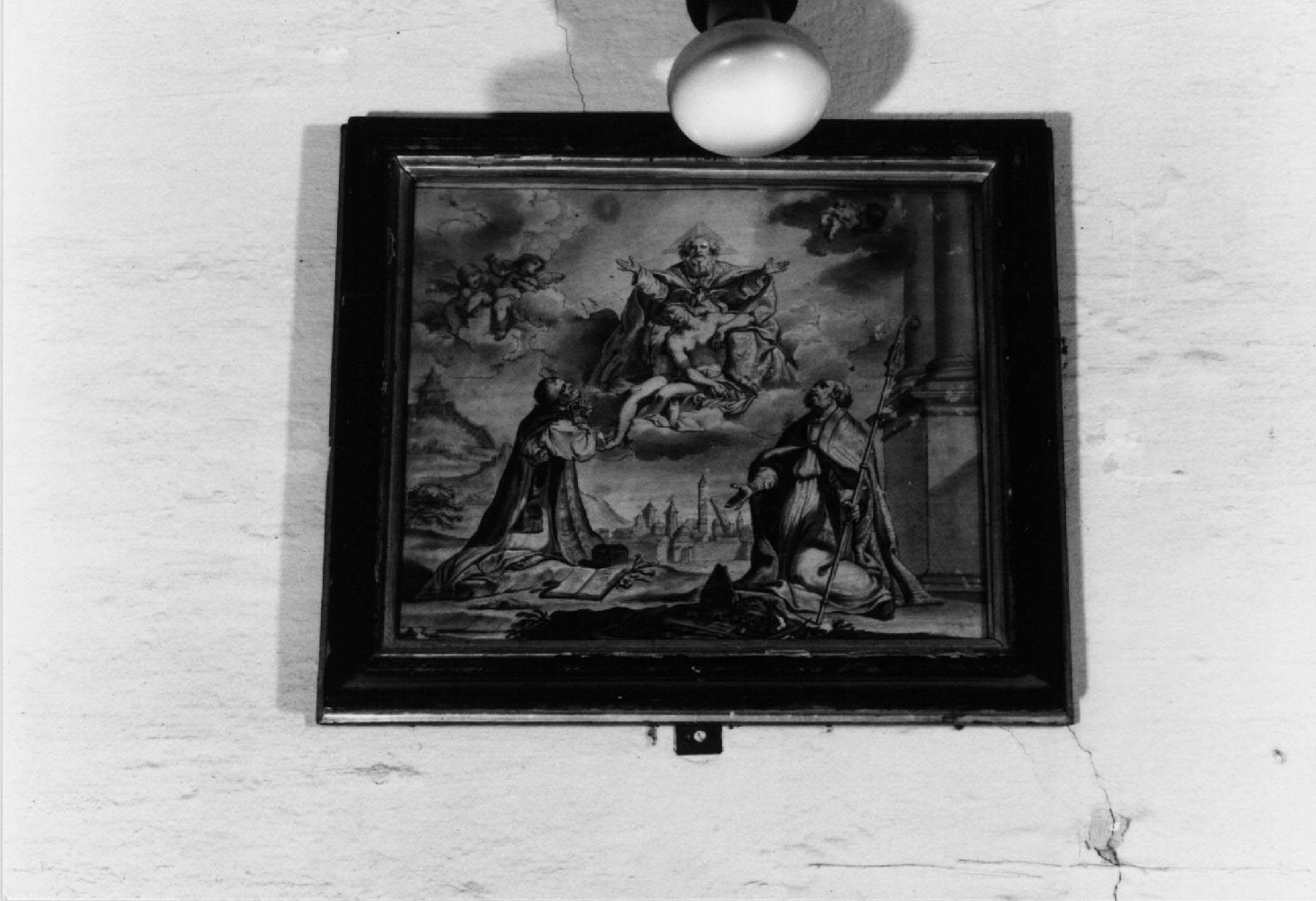 In alto Dio Padre con il Figlio seduto fra le sue gambe, adulto. Ai lati angeli fra nubi. In basso, inginocchiati, due santi, sullo sfondo la città di Bologna
