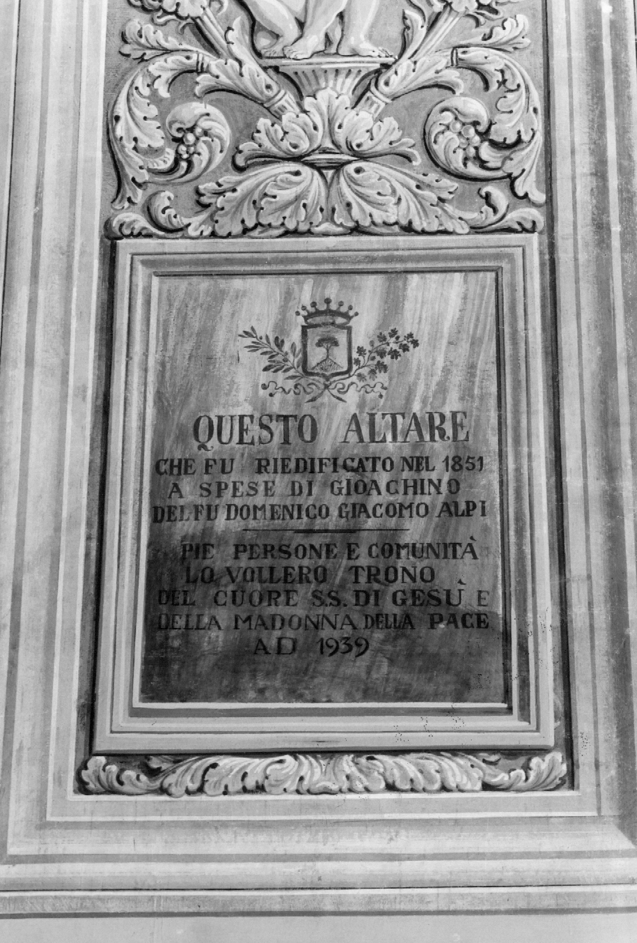 - ISCRIZIONI parete destra - QUESTO ALTARE/ CHE FU RIEDIFICATO NEL 1851/ A SPESE DI GIOACCHINO/ DEL FU DOMENICO GIACOMO ALPI/ PIE PERSONE E COMUNITA'/ LO VOLLERO TRONO/ DEL CUORE SS. DI GESU' E/ DELLA MADONNA DELLA PACE/ A D 1939 - lettere capitali - a pennello -