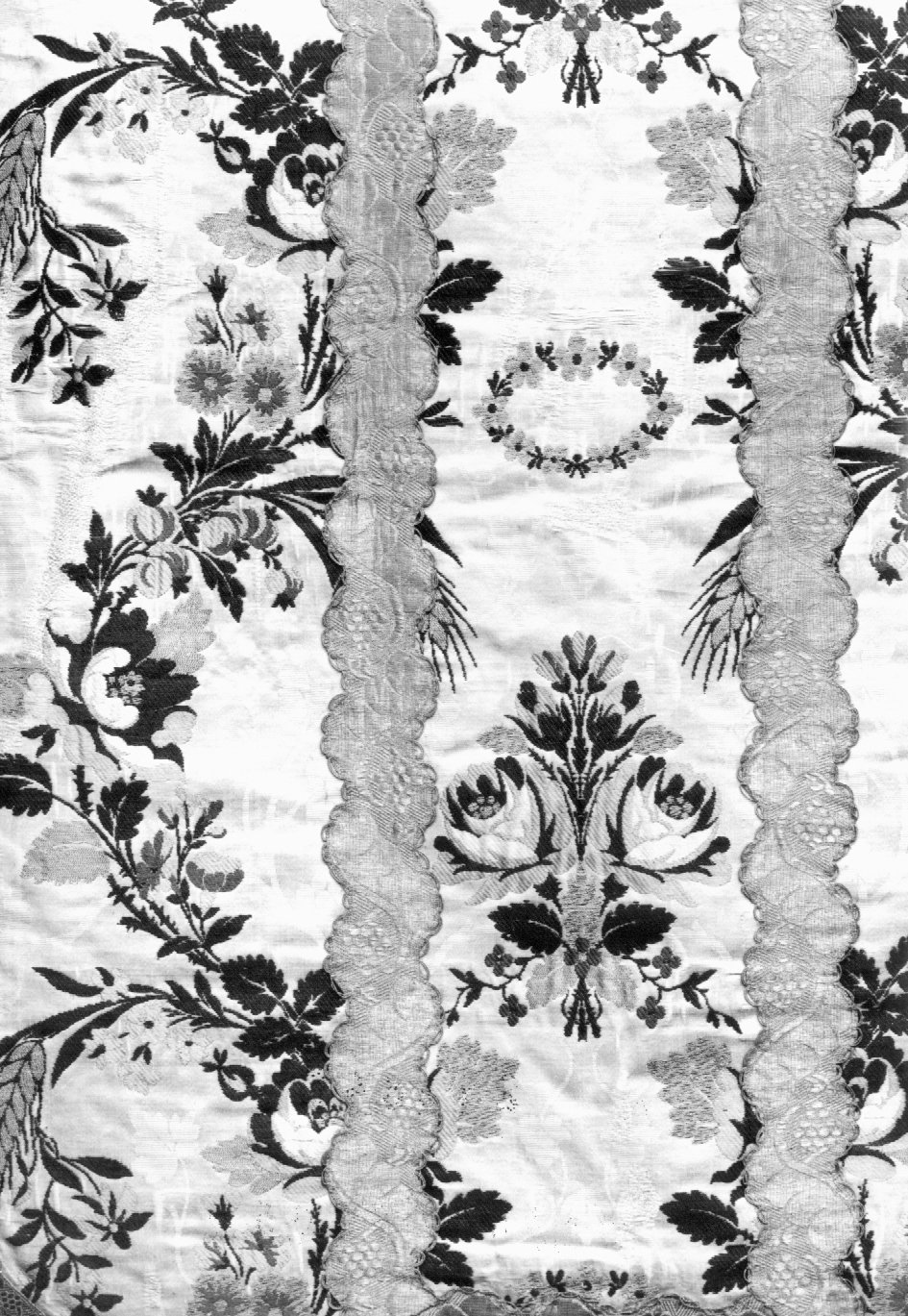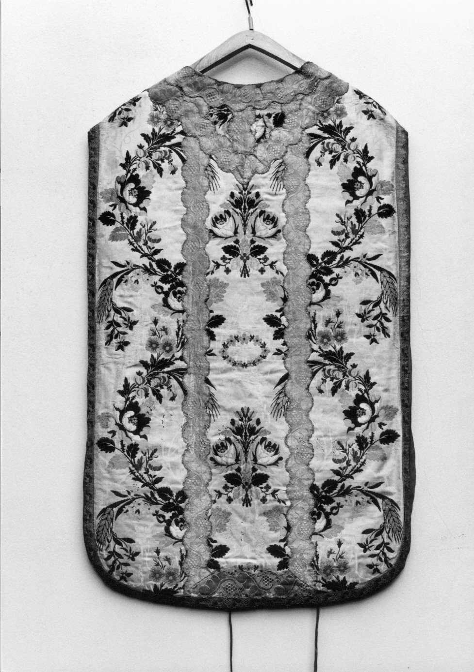 Paramento liturgico composto da due pianete una stola e un velo di calice. Damasco broccato con ornato a festoni ad andamento sinuoso caratterizzato da grandi mazzi alternati al centro da una coroncina di fiori. Lateralmente si snodano ampie volute con tralci di fiori da cui si dipartono spighe. Tonalità accese del giallo, rosa, bordeaux, bianco e lilla