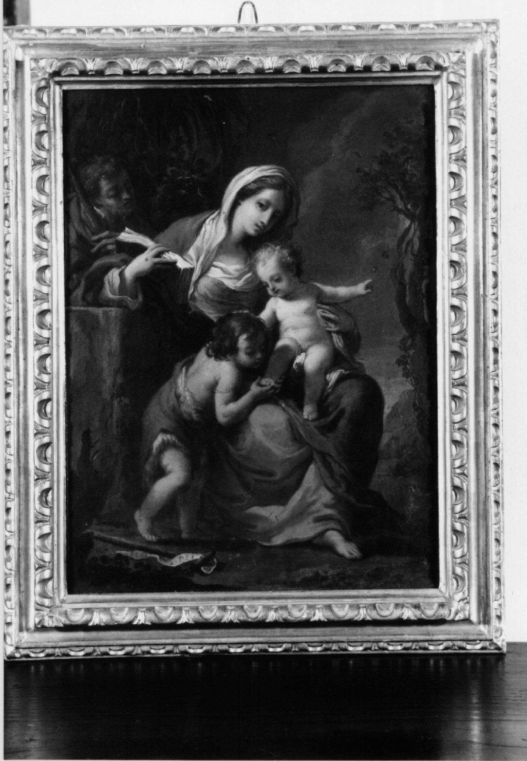 La Madonna, seduta, regge il Bambino sulla gamba destra; accanto è San Giovanni Battista bambino che si china su un piede di Gesù