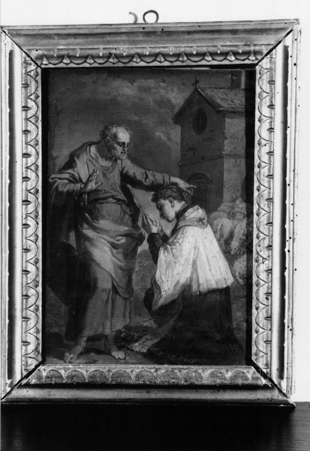 San Pietro in piedi, di tre quarti verso destra, si rivolge ad un giovane in abiti sacerdotali inginocchiato davanti a lui e gli indica alcune figure sullo sfondo dove si trova anche una chiesa