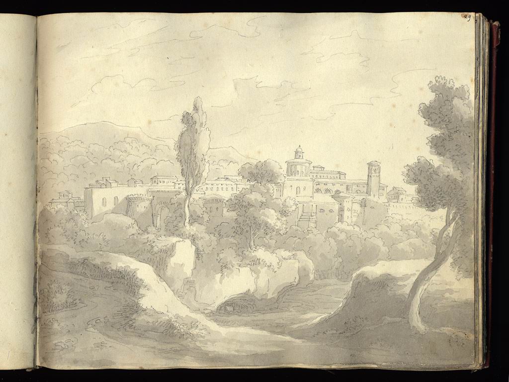 prospettive e paesaggio in città. veduta con alberi e borgo fortificato