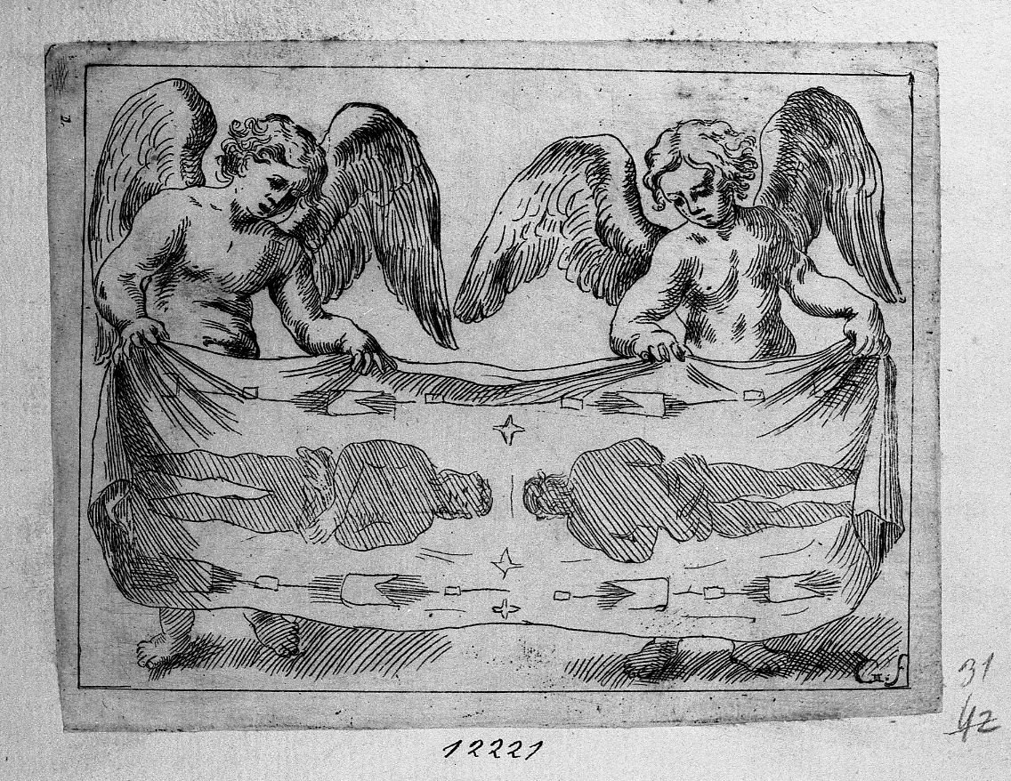 Due angioletti che reggono un lenzuolo con Sacra Sindone (?)