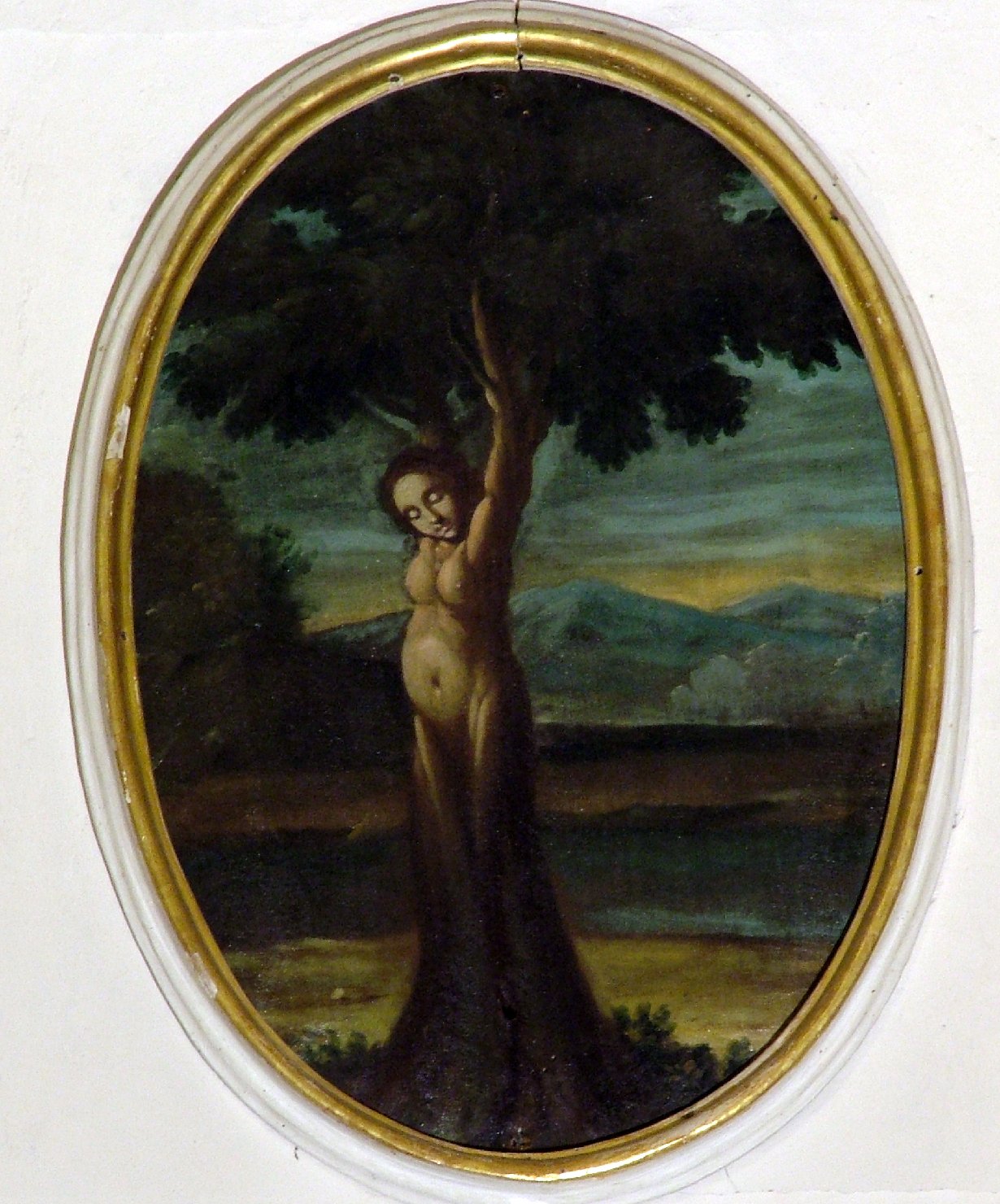In primo piano una figura metà donna e metà albero; sullo sfondo una profonda radura e montagne in lontananza