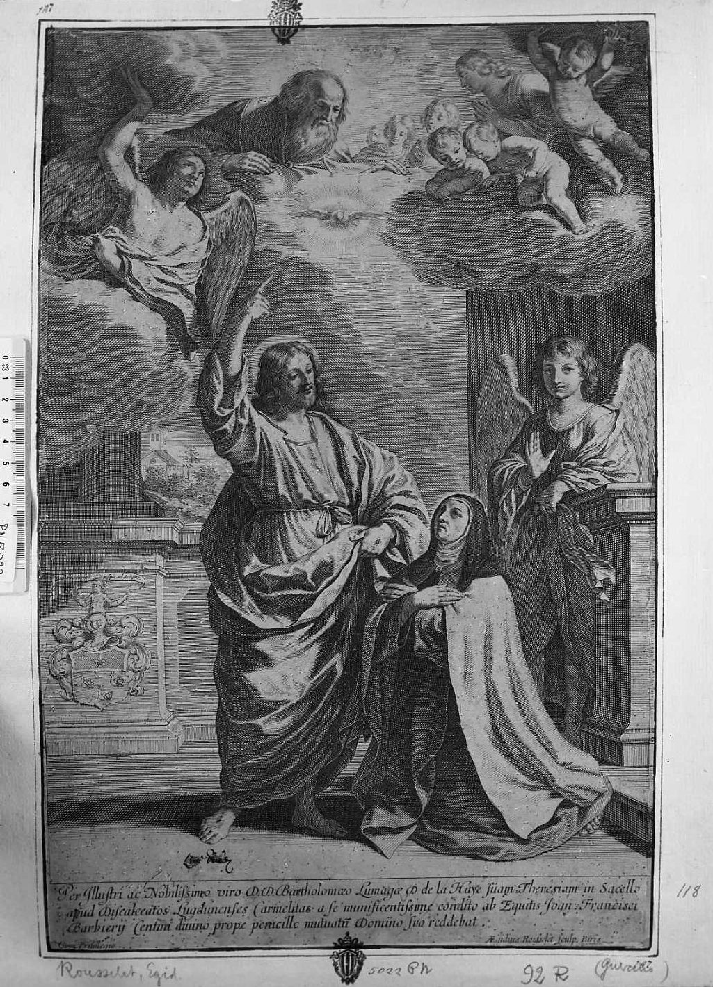 Personaggi: Gesù Cristo; santa Teresa; Dio Padre. Figure: angeli. Araldica