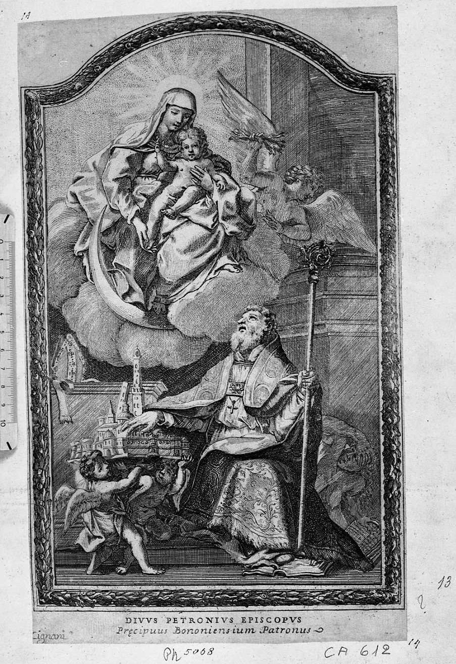 Personaggi: san Petronio; Madonna; Gesù Bambino. Figure: angelo; putti. Attributi: (san Petronio) modello della città di Bologna; mitra; pastorale. Figure maschili. Oggetti: libro