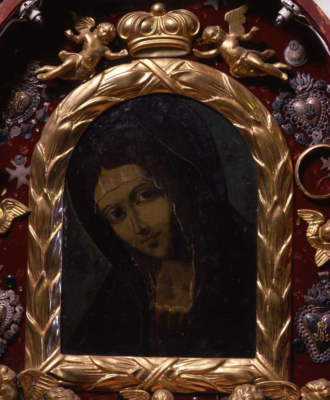 La Vergine è rappresentata a mezzobusto, con il capo coperto dal manto scuro, sovrapposto ad un leggero velo bianco. Il capo è leggermente reclinato sulla spalla destra. Da sotto il manto spunta un lembo di veste rosso scuro