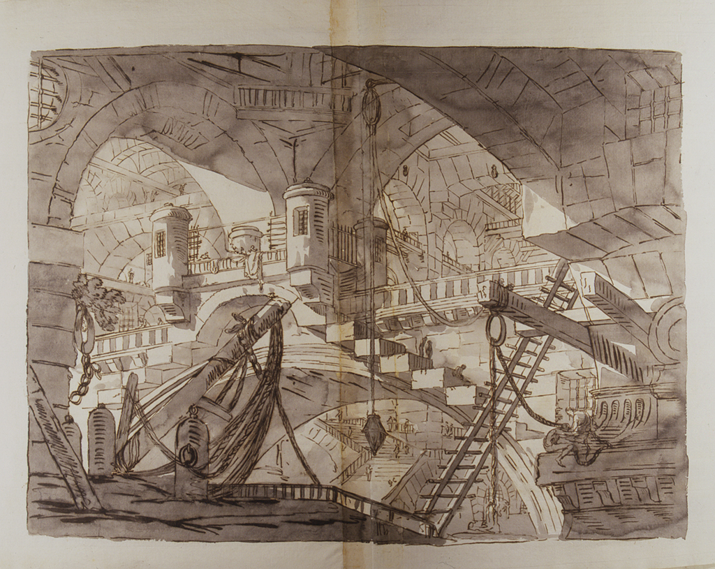 - NOTIZIE STORICO CRITICHE Le tavole 133 - 156 sono descritte nell'indice in questo modo: "Dal 132 al 156 - Piranesi, Invenzioni di Carceri, con suplizi diversi - Prima, angolo D'introduzione alla medesima, altre col suplizio della Ruota Grafiante/colla Fune per slocare le Braccia, Catene e Graffi per Grafiare la Carne, Lapide Infamanti, Munizioi, Scuri, Ruote per la Tortura/Ritratti de malfatori, cipi, e colonne Parlanti dei Delitti, con bassi rilievi, iscrizioni - Garette per le Guardie, Lampioni d'ogni forma/Suplizio della perpetua Catena, ossia li ferri duri, Ruota con uncini per trasportare a Pendoloni i delinquenti, Finestre per le urbaje/sotteranee, e tutto ciò che potuto Ideare La Tirania de Barbari, queste Grandi Composizioni, Sono, Luogi Eterni d'Introduzione con atrji,/Cortili, con Scale, Ponti, arcate, Fittoni, Parapetti, Ponti Levatoi, Bertesche, Modiglioni, e Merlatue, Ponte e Finestre di Ferro -". Il riferimento per il disegno in esame è la stampa dal titolo "Capriccio con pozzo" dell'opera "Invenzioni Capr. di Carceri" di Piranesi