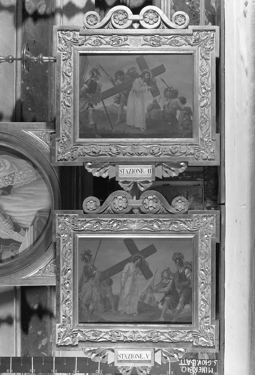 Il dipinto raffigura la seconda stazione della via Crucis. Gesù, al centro di profilo, con la croce in spalla, è sospinto da un guerriero con lancia e preceduto da un altro a cavallo e da un carnefice che reca, infilato nella lancia, un cesto di arnesi