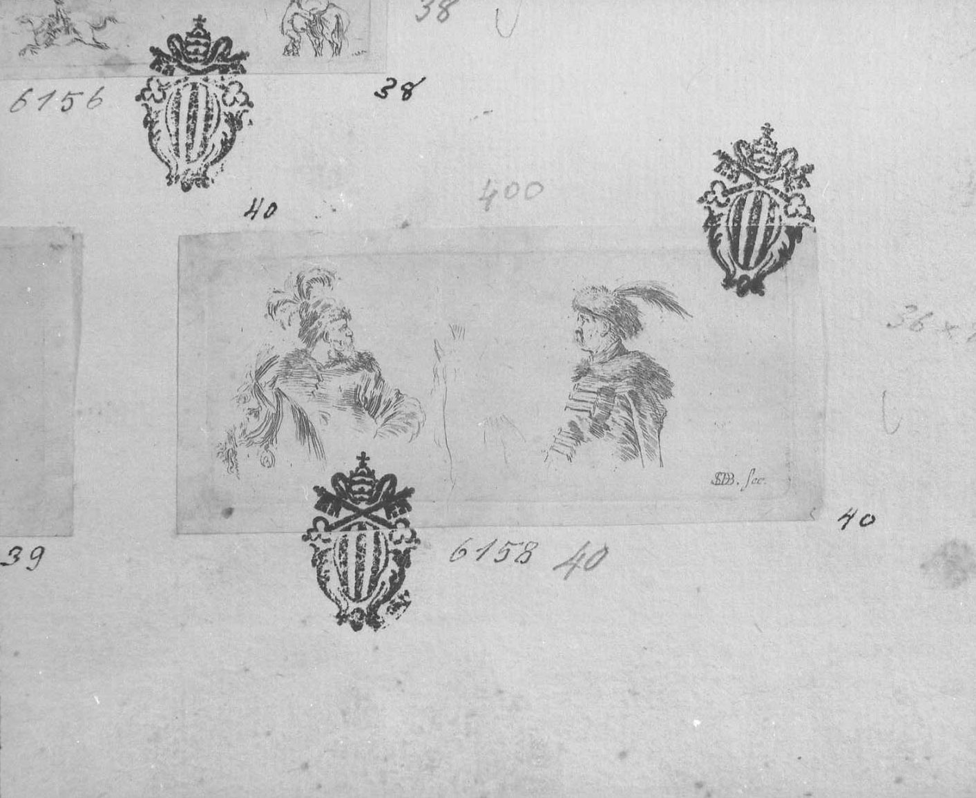 - STEMMI sul supporto primario: recto: in basso ed in alto - cardinalizio - Stemma - Lambertini - 2 - stemma cardinalizio ad inchiostro nero con due chiavi incrociate e la mitra papale