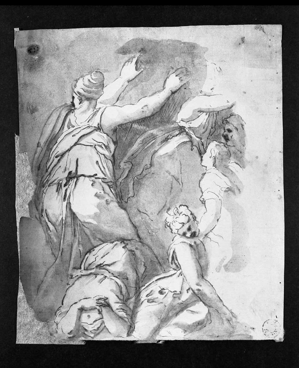 Disegno rappresentante cinque figure e una testa a destra, tutte femminili, in atteggiamenti diversi: una a sinistra vista da tergo con le braccia sollevate, una per terra bocconi con le mani al capo, una in basso a destra con la testa chinata, una vista di fianco, in alto una figura senza testa con un braccio sollevato