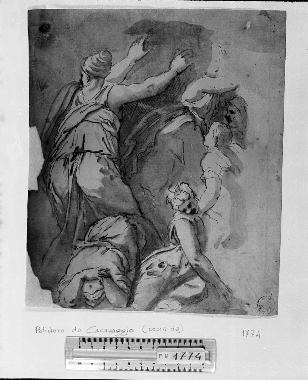 - NOTIZIE STORICO CRITICHE Tradizionalmente attribuito ad anonimo del XVII secolo, fu assegnato da Mario Massaccesi a Taddeo Zuccari ma Philip Pouncey lo riconobbe come copia non autografa da un fregio di palazzo Milesi dipinto da Polidoro da Caravaggio