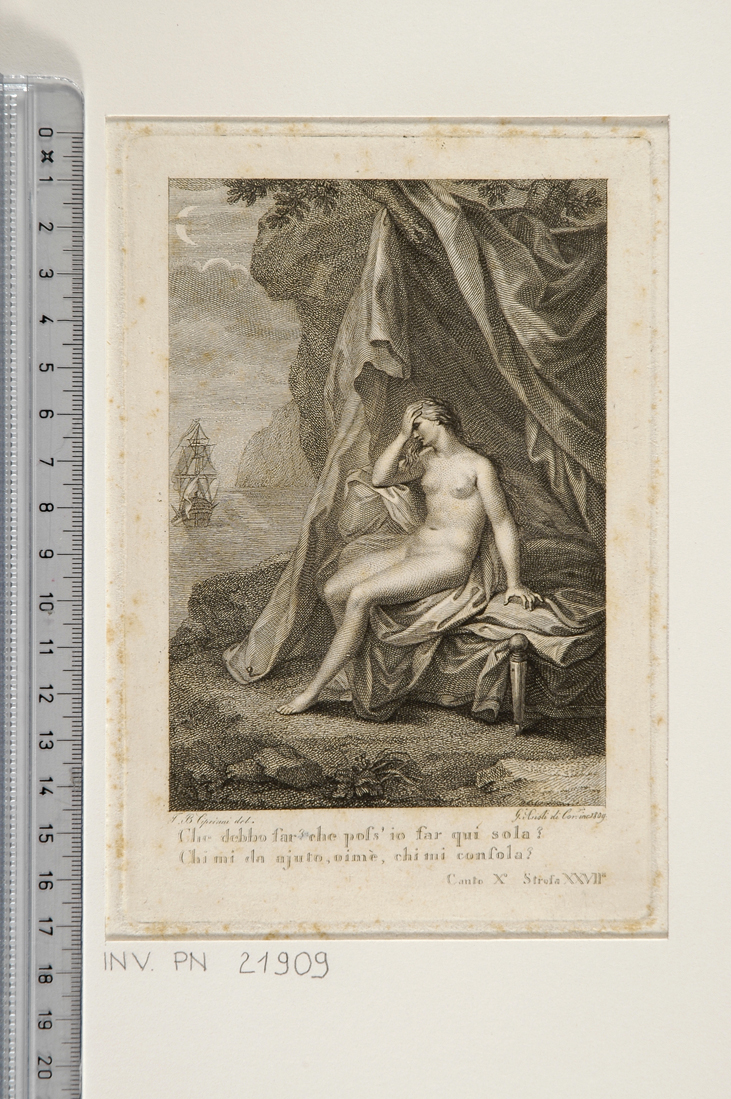 - NOTIZIE STORICO CRITICHE I due versi che fanno da didascalia alla stampa sono tratti dall'Orlando furioso, poema di Ludovico Ariosto. Sono quelli che chiudono la ventisettesima strofa del decimo canto, che narra di come Angelica al risveglio, non trovando al suo fianco l'amante al quale si era accompagnata e vedendo la sua nave allontanarsi, si disperi per l'abbandono subito