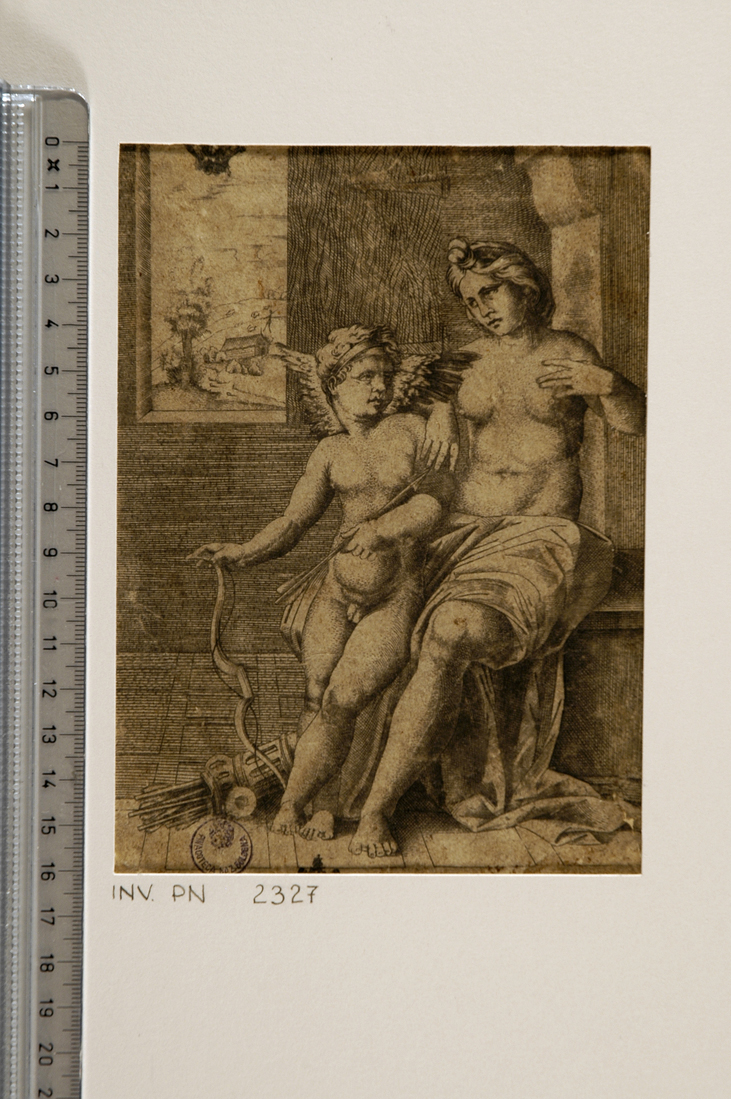 Personaggi: Venere; Cupido. Attributi: (Cupido) ali; arco; frecce; faretra. Interno. Elementi architettonici: pilastro; mensola; finestra. Paesaggi: paesaggio con casa