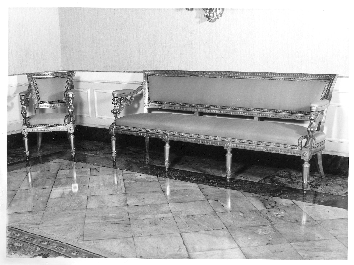 Il divano poggia su sei gambe, le poltrone su quattro: quelle posteriori sono lisce, a sezione quadrangolare, con lieve curvatura estroflessa; le gambe anteriori sono tornite a birillo, rastremate al basso, con giro di foglie al piede, poggiante su piccola sfera. La fascia di raccordo è intagliata a ghirlanda d'alloro con piccoli nastri e si ripete nelle spalliere, a sagomatura trapezoidale con base minore in basso. I braccioli si reggono su cariatidi zoomorfe alate e sono aperti. I sedili sono staccati dallo schienale e coperti di stoffa marrone moderna, con passamaneria decorata a greche