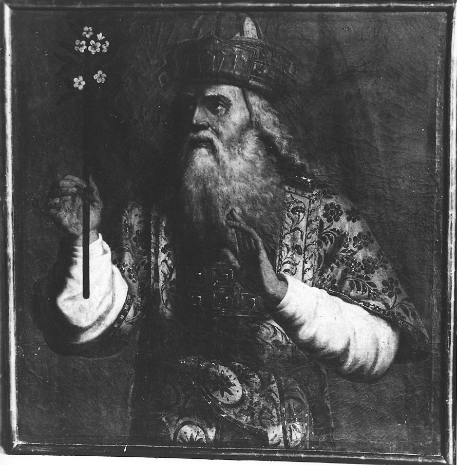 Figure: sacerdote ebraico. Abbigliamento: ricco abito ricamato; copricapo orientale. Oggetti: ramo fiorito (di S. Giuseppe ?)
