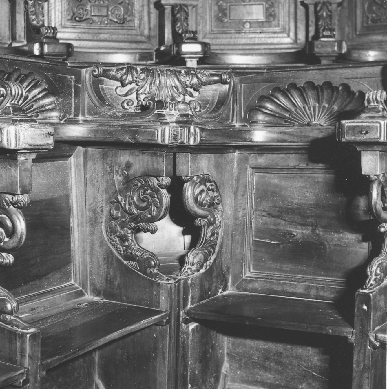 - NOTIZIE STORICO CRITICHE Creduto dalle guide (Buttafuoco, Cerri, Aurini) opera di Matteo Grattoni, il coro in realtà fu intagliato da Giulio Rossi (documenti esistenti presso l'archivio del convento, pubblicati dal Corna nel 1908), che si impegna ad eseguire l'opera il 28 settembre 1560, e la conduce a termine nel giro di cinque anni. Insieme di effetto, con particolari, quali le volute dei braccioli e il raccordo degli stalli d'angolo dell'ordine inferiore, che rivelano la maestria di chi lo eseguì