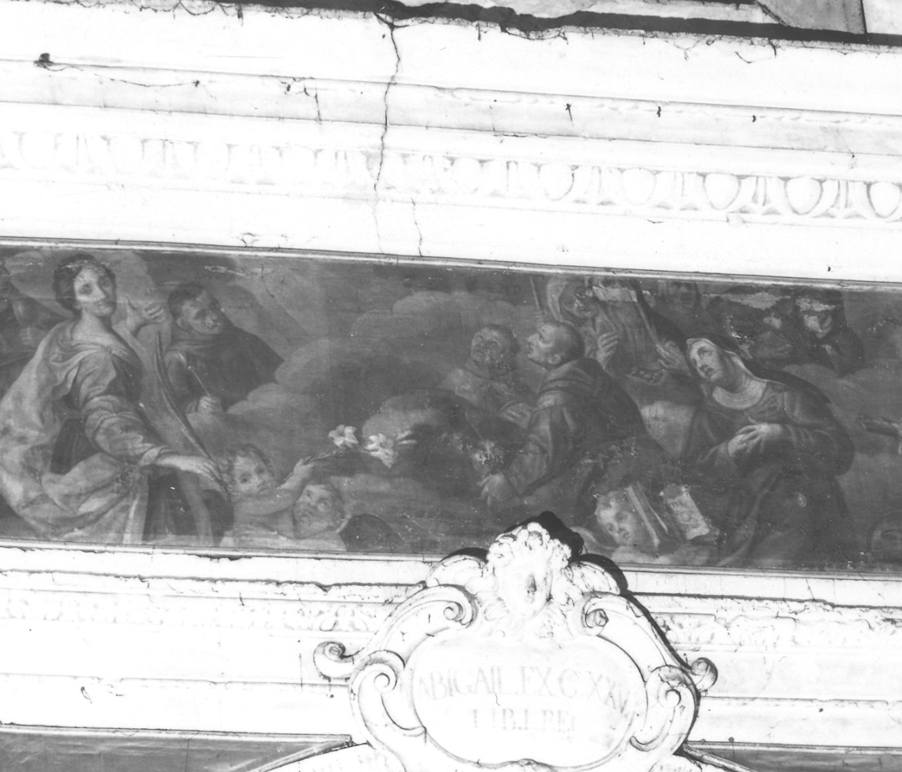 Personaggi: San Francesco d'Assisi; Santa Chiara; Santa Vittoria. Figure: Santi francescani; angioletti. Attributi: (Santa Vittoria) ramo di palma. Oggetti: crocifisso; libro. Fiori: gigli. Fenomeni naturali: nubi