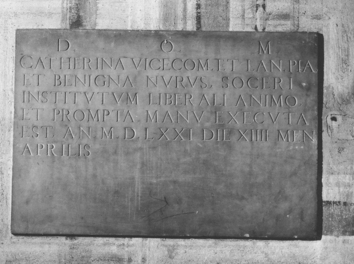 - ISCRIZIONI D. O. M./ CATHERINA VICECOM. ET LAN. PIA/ ET BENIGNA NURUS, SOCERI/ INSTITUTUM LIBERALI ANIMO,/ ET PROMPTA MANU EXECUTA/ EST, AN MDLXXI DIE XIIII MEN./ APRILIS - lettere capitali - a incisione -