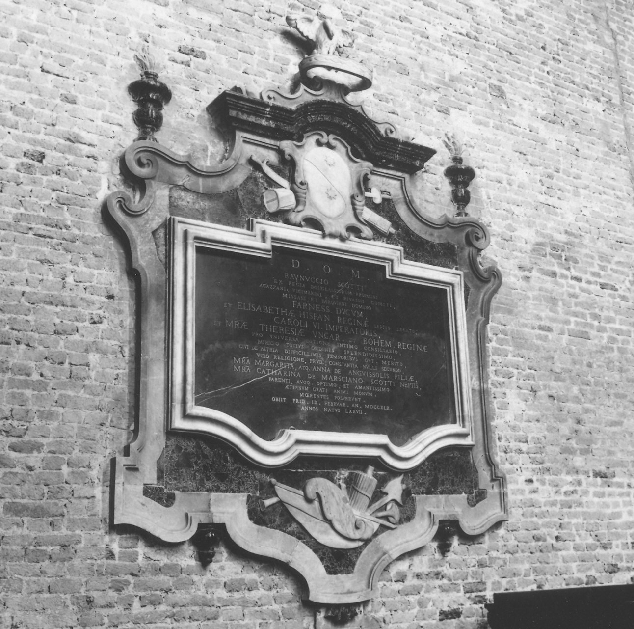 - ISCRIZIONI D. O. M./ RAYNUCCIO SCOTTI/ EX REGIA DOUGLASSIORUM PROPAGINE/ AGAZZANI, VICIMARINI ET RIVASSII COMITI,/ MISSANI, ET TARQUINIANI DOMINO/ FARNESE DUCUM, ET ELISABETHAE HISPAN. REGINAE SAEPIUS LEGATO,/ CAROLI VI IMPERATORIS, ET MRAE THERESIAE UNGAR. ET BOHEM. REGINAE/ PRO UNIVERSA DITIONE INTIMO CONSILIARIO, PATRICIO TOTIUS ORDINIS SPLENDIDISSIMO,/ CIVI DE PATRIA DIFFICILLIMIS TEMPORIBUS OPT. MERITO,/ VIRO RELIGIONE, PRUD., CONSTANTIA NULLI SECUNDO,/ MRA MARGARITA, ATQ. ANNA DE ANGUISSOLIS FILIAE, MRA CATHARINA DE MARSCIANO SCOTTI NEPTIS,/ PARENTI AVOQ. OPTIMO, ET AMANTISSIMO/ AETERNUM GRATI ANIMI MONUM./ MOERENTES POSUERUNT./ OBIIT PRID. ID. FEBRUAR. AN. MDCCXLII/ ANNOS NATUS LXXVII - lettere capitali - a incisione -