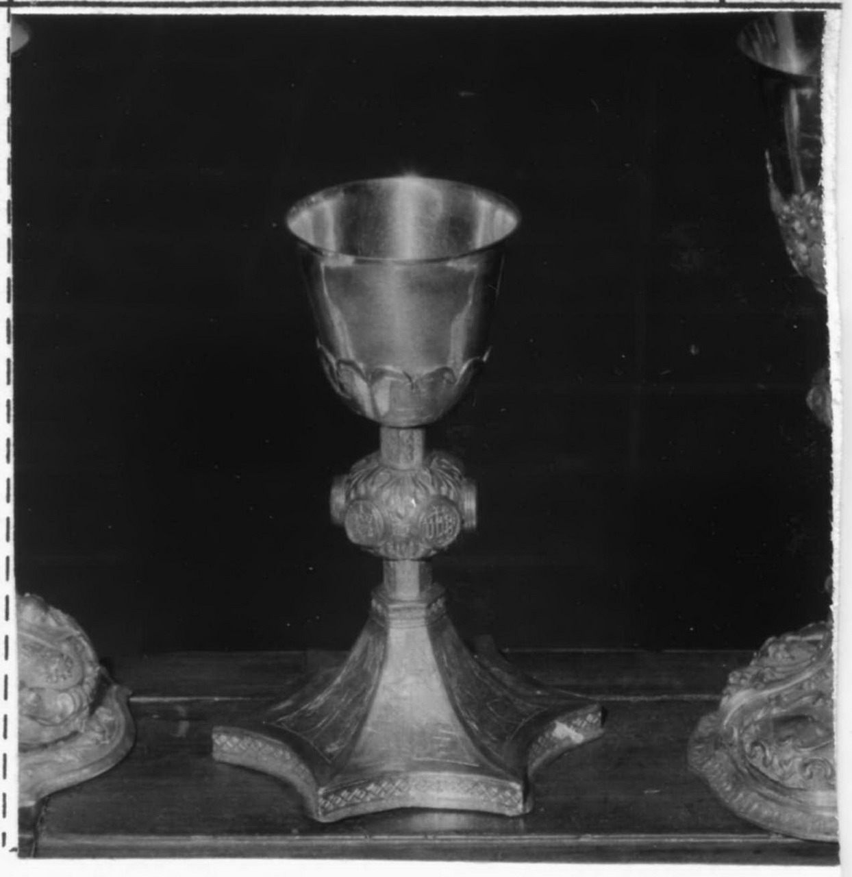 Base stelo e sottocoppa in rame operato a sbalzo, cesello su parti di fusione e completamente dorato. Nello stelo placche con il monogramma di Cristo. Coppa in argento sbalzato, dorata internamente