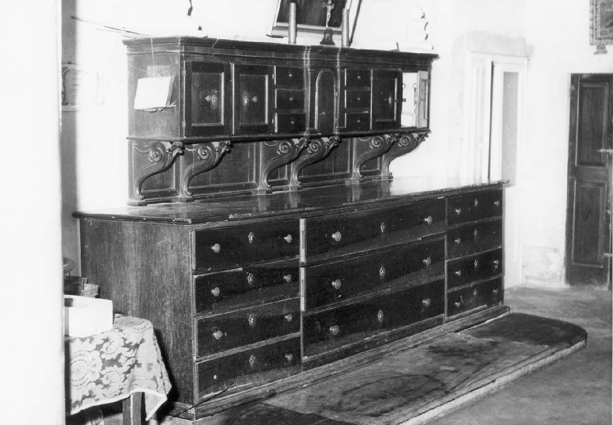 Bancone con dodici cassetti ed alzata sostenuta da due mensole intagliate con tabernacolo centrale fiancheggiato da tre sportellini. Bocchette e maniglie in bronzo