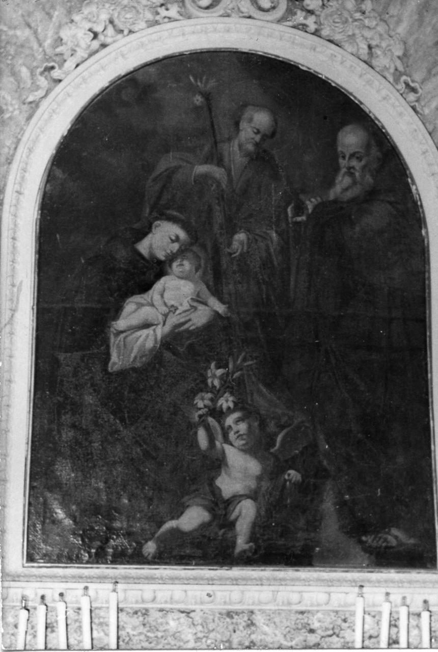Tela centinata. Al centro è S. Antonio da Padova che abbraccia il Bambino Gesù. In secondo piano i Santi Antonio Abate in tonaca bruna e Giuseppe, con manto giallo. Inserito entro cornice fissa di stucco