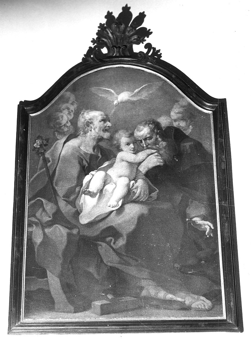 Personaggi: San Giuseppe; Gesù Bambino; Sant'Antonio Abate. Figure: cherubi. Simboli: Colomba dello Spirito Santo. Attributi: (San Giuseppe) bastone fiorito; pialla. Attributi: (Sant'Antonio Abate) maiale. Abbigliamento: (Sant'Antonio Abate) tsaio coll'insegna del Tau. Mobilia: sgabello