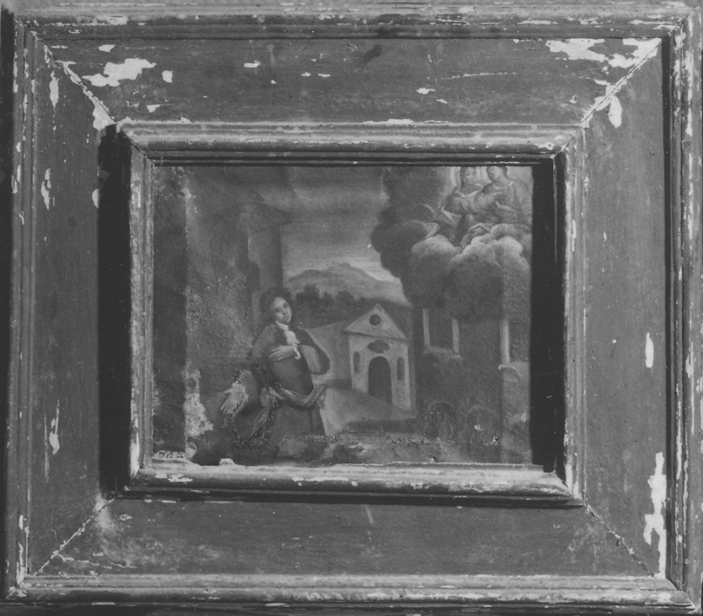 Entro cornice originale in legno, di forma rettangolare, con profilature modanate. Il devoto appare inginocchiato in primo piano, le Sante su nubi nell'angolo superiore destro