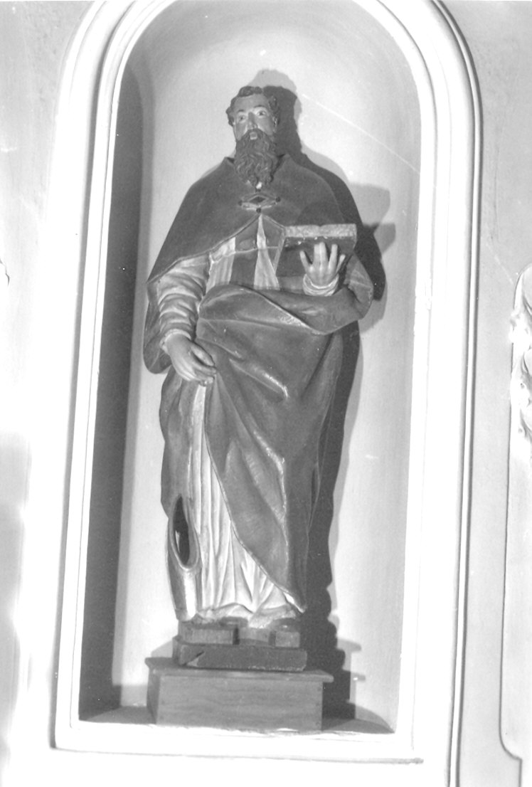 Il Santo, vestito dei sacri paramenti, è colto staticamente, mentre con la mano destra trattiene il piviale rosso e con la sinistra sorregge un libro aperto