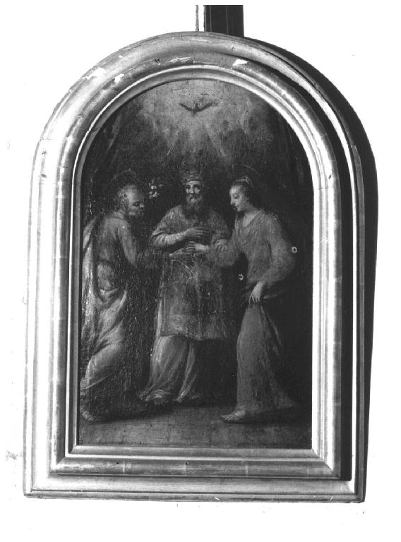 - NOTIZIE STORICO CRITICHE Il dipinto, sia pure di modesta qualità, non è privo di una certa dignitàformale nel disegno disinvolto delle figure (specialmente in quella di S.Giuseppe) ed in una certa proprietà e ricercatezza nell'uso del colore. Alla ripresa della tradizionale iconografia dello sposalizio della Vergine questo pittore, probabilmente della prima metà dell'Ottocento, è riuscito aconferire una certa unità e grazia, aiutato in ciò dalle piccole dimensioni del dipinto, che fra l'altro meglio lo avvicinano al gusto moderno