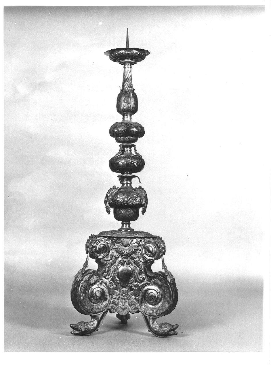 I candelieri, che poggiano su piedi a testa di delfino, presentano base a sezione triangolare, con nastri piatti a volute concave e convesse negli angoli, mentre sulle facce ampie volute racchiudono un ovato centrale lievemente bombato, sormontato da pendoni floreali, sotto il quale sono un mascherone ed una conchiglia. Il fusto, che termina con un motivo a scanalature leggermente avvolte a spirale, é formato da tre nodi, solcati da motivi fogliari e da pendoni di fiori e frutta a tenue rilievo. Teste di cherubi e minuscoli pendoni eseguiti a fusione sono applicati al nodo inferiore, a forma di vaso, al nodo centrale e agli spigoli della base. Il piattello presenta motivo a baccelli