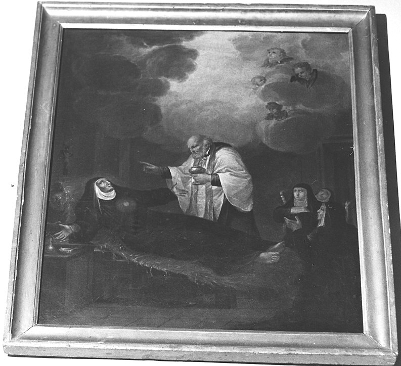 Personaggi: Santa monaca. Ecclesiastici: sacerdote; monache. Figure: cherubini. Fenomeni divini: alone luminoso; nubi. Suppellettili ecclesiastiche: pisside; crocifisso. Costruzioni: giaciglio. Oggetti: cassa; piattino; ampolla. Abbigliamento religioso