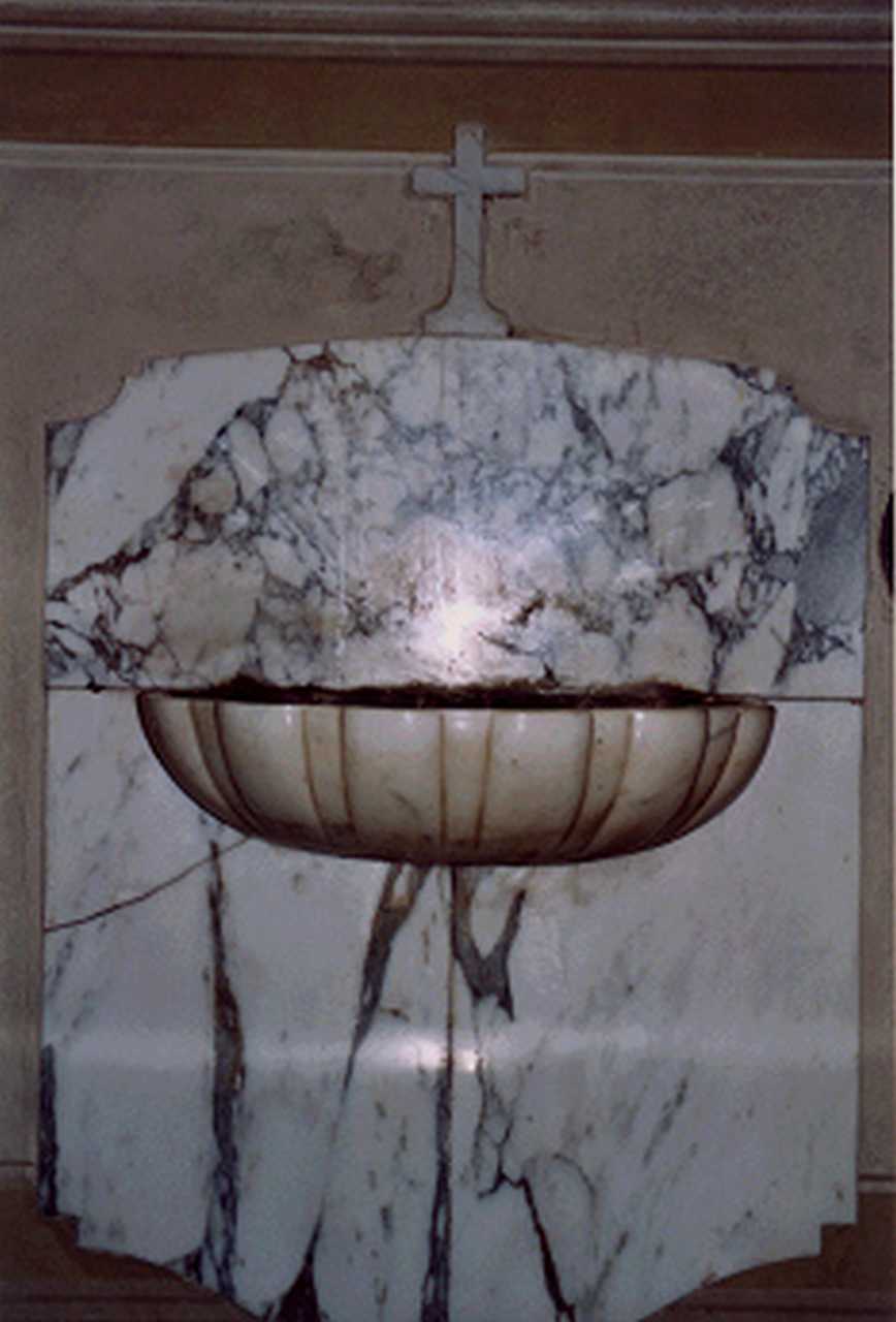 - NOTIZIE STORICO CRITICHE Don Vincenzo Mori, nella sua "Descizione" della chiesa , datata 1742, menzionava la presenza di una "vasca di marmo per l'acquasanta", oggi esiste un acquasantiera in marmo bianco scolpito, incassata alla parete nella contro-facciata a destra, questa opera di ignoto marmorario è però datata 1764, infatti vi è una iscrizione sotto di essa: "ANG. US. CELLA. ARCHIPR. 1764". Dunque l'odierna acquasantiera è stata fatta nel periodo in cui era parroco Don Angelo Cella (parroco dal 1751 al 1788) e sostituiva l'acquasantiera precedente menzionata da Don Mori (parroco dal 1742 al 1750). In diverse opere della chiesa ritroviamo la committenza della nobile famiglia Cella (da cui proveniva lo stesso parroco) di Piacenza, in questo caso l'acquasantiera a parete ha uno stile diffuso nel XVIII secolo, appare di discreta fattura, di solito acquasantiere analoghe sono realizzate in una più modesta arenaria, mentre questa è scolpita nel più nobile marmo