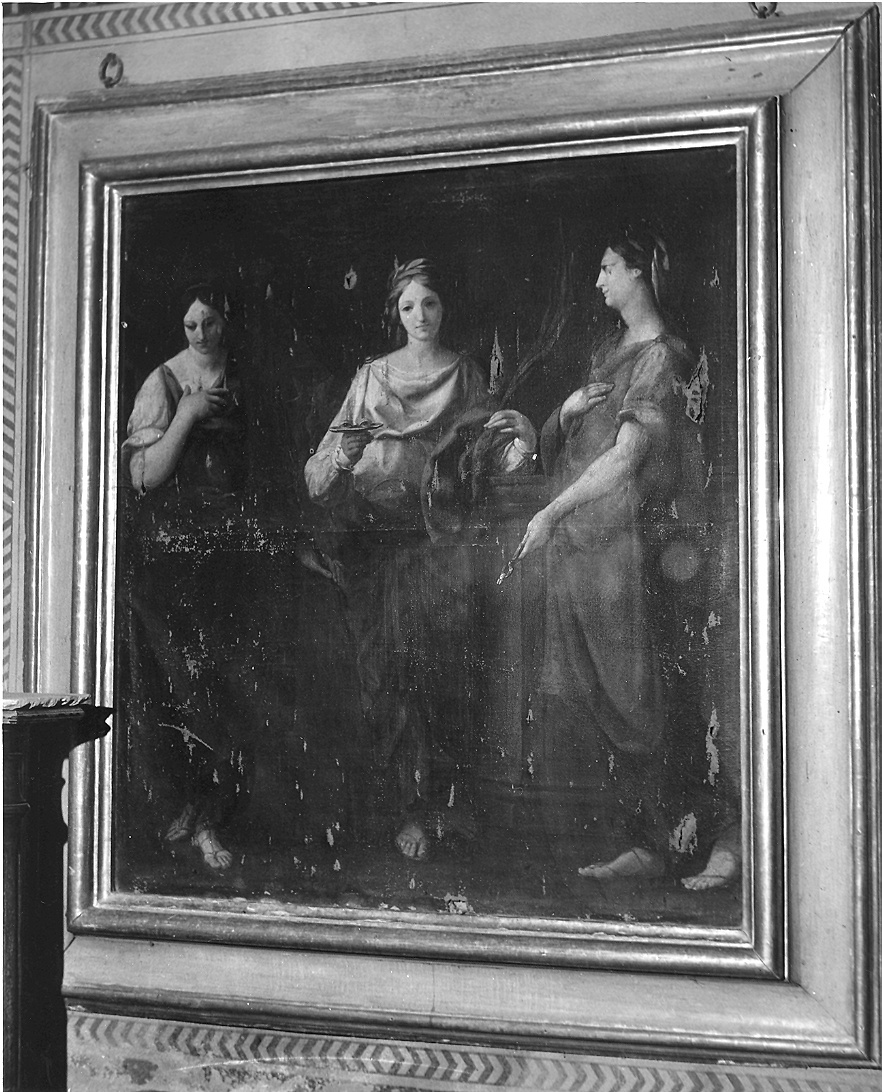 - NOTIZIE STORICO CRITICHE Originariamente il dipinto era collocato sull'altare dedicato alle tre sante, lungo la parete sud della chiesa (inventario del 1829), ma a seguito dei lavori compiuti per volontà di don Vignali, che volle riportare la chiesa all'antico aspetto romanico, nell'inventario del 1941 risulta già trasferito in canonica insieme agli altri dipinti di proprietà della Badia. Eliminati gli antichi altari, sostituiti da mense e mattoni, non ritenne più consono al nuovo clima architettonico il precedente arredo liturgico. Questo dipinto viene attribuito da Cirillo e Godi al padre francescano Atanasio Favini da Coriano, che, nato a Coriano nel 1749, frequentò l'Accademia di Parma ed ebbe come maestro Pietro Ferrari. Successivamente si trasefrì a Bologna, a Roma e ancora in Emilia e a Macerata dove in tarda età aprì una scuola di pittura. Visse 94 anni e realizzò numerose opere non tutte identificabili, conferendo grande importanza al valore religioso delle immagini. Le sue opere più mature, prevalentemente situate in Romagna, rivelano oltre alla matrice parmigiana mutuata dal Ferrari, lo sforzo di coniugare forme neoclassiche con temi sacri caricandoli di una forte energia sentimentale e talvolta di drammaticità. A Parma ha lasciato alcune opere riconducibili alla sua mano "Beato Buralli" (chiesa dell'Annunziata) un "Compianto" e una "Presentazione al Tempio" (S. Michele all'arco) datati 1792. Anche questo dipinto è sicuramente riconducibile nell'alveo della pittura neoclassica e mostra un pittore di alta qualità, raffinato nel coniugare il gusto per l'antico, evidente nel dettato della moda, ad antiche memorie seicentesche che emergono nelle cromie, memori dell'opera dello Schedoni. L'attribuzione a padre Atanasio, proposta da Cirillo e Godi, non convince però pienamente, anche se in alcune oper tarde del francescano (cfr. "San Francesco dà la regola a Santa Chiara" Monte S. Giusto, chiesa del ricovero, 1835 ca.) è possibile riconoscere un uso del colore prossimo alla pala di Badia Cavana. Il nostro pittore sembra comunque collocarsi in un clima pienamente parmigiano, aggiornato sulle novità proposte da pittorii come Landi o successivamente anche Borghesi rivelando quindi una formazione accademica già pienamente neoclassica, mentre non pare possibile identificare alcun riferimento alla pittura di Ferrari o più in generale al gusto pittorico del Settecento emiliano