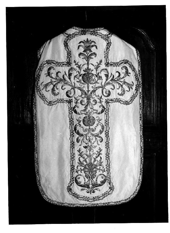 - NOTIZIE STORICO CRITICHE Riportato su una pianeta piuttosto brutta, s'intravede nel melograno la base originale: raso bianco, tuttavia non è certo che si tratti dell'unico riporto. Altri piccoli frammenti di ricamo sono stati utilizzati per decorare la stola, il manipolo, la busta ed il velo del calice, ma sono estremamente miseri e di scarso significato. Il ricamo di notevoli dimensioni è molto unitario, ha una struttura a candelabra, e vi tornano motivi araldici quali la melograna, il giglio, la conchiglia etc. L'unione dei due elementi distinti della struttura a candelabra con motivi araldico-simbolici, fanno pensare ad un periodo a cavallo tra la prima e la seconda metà del '700. E' presumibilmente una produzione locale in quanto i ricami non avevano all'epoca un commercio analogo a quello dei tessuti