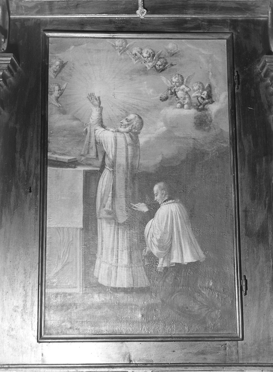 - NOTIZIE STORICO CRITICHE Discreto dipinto settecentesco, dell'epoca dell'armadio in cui è inserito, di preparazione alla messa. Difficile è individuare l'area culturale di appartenenza, forse di ambito piacentino, dello stesso Antonio Maria Peracchi che in San Michele a Grezzo dipinse il baldacchino. Nelle tonalità, nella gloria di angeli e cherubi è possibile vedere alcune somiglianze stilistiche