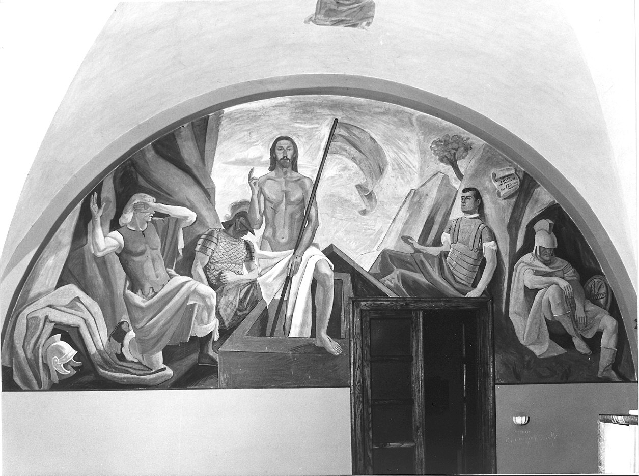 Personaggi: Gesù Cristo. Figure: soldati. Oggetti: sepolcro; vessillo. Fenomeni geologici: rocce; grotta