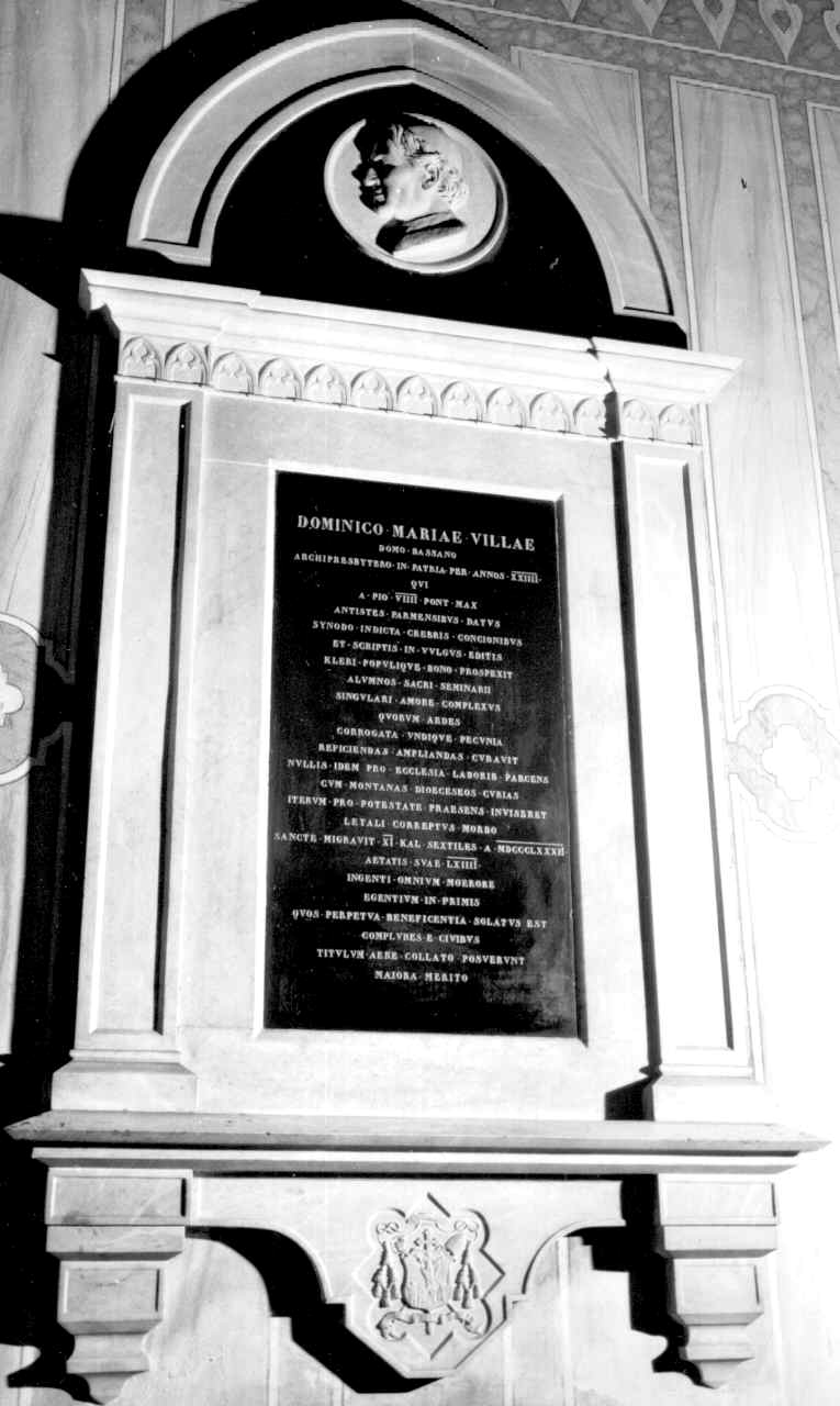 - NOTIZIE STORICO CRITICHE E' probabile che il monumento sia stato eretto in occasione del trasferimento della salma del vescovo Domenico Maria Villa dal cimitero pubblico alla cattedrale avvenuto nel 1909; in questa occasione, infatti, la sua salma fu esumata e trasportata con una solenne processione in duomo. L'epigrfae ricorda che Domenico, nato a Bassano nel 1882, era stato arciprete nel suo luogo natio per ben ventiquattro anni, dopo di che era stato nominato vescovo dei parmnesi da papa Pio IX. Inoltre, l'iscrizione rammenta le sue opere di bene: l'amore nutrito per gli alunni del Sacro Seminario, le continue visite alle parrocchie montane della diocesi, l eopere di beneficenza per i poveri. Ancora è riferito che la lapide in questione era stata posta da un folto gruppo composto da gente comune, raccoltasi spontaneamente per onorare una persona tanto magnanima e generosa. Anche i adti stilistici sembrano cofermare, per quanto concerne il monumento, una datazione agli inizi del XX secolo