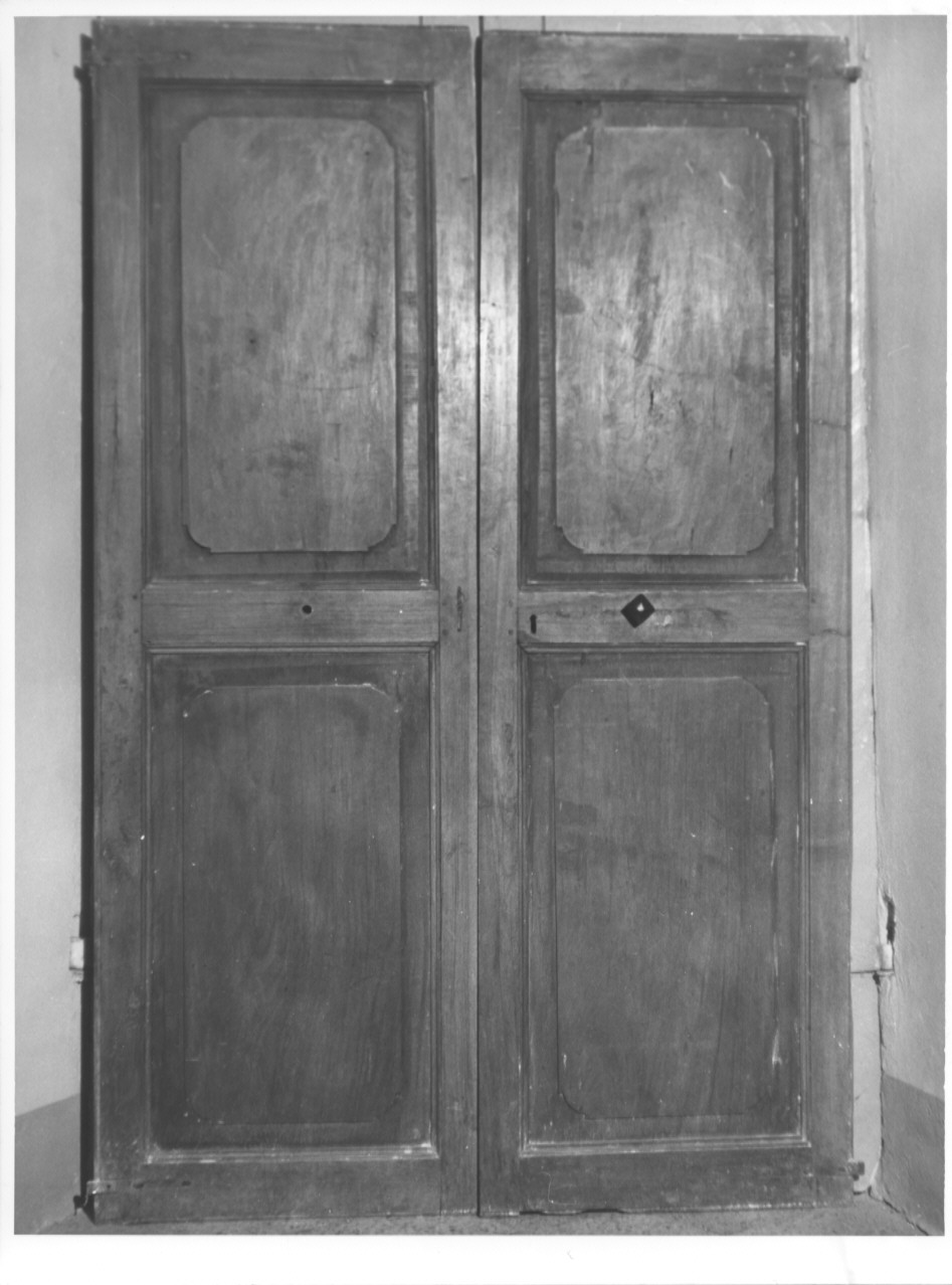 Ante di armadio a muro in legno di noce, compartite in due specchiature con semplici incorniciature lineari a più risalti. Il riquadro centrale è in rilievo con angoli arrotondati e i pomoli hanno forma poliedrica