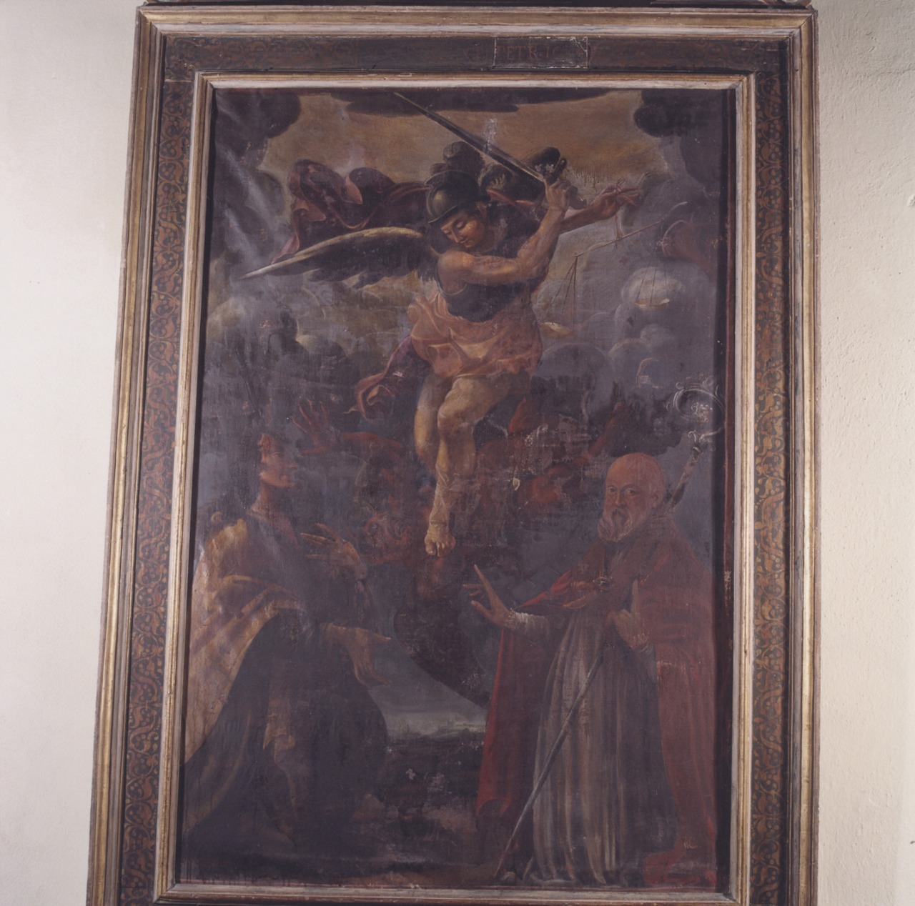 - NOTIZIE STORICO CRITICHE Pur presentando caratterizzazioni cinquecentesche, soprattutto nel S. Michele, nel movimento del corpo, nel panneggio dei manti, nel calzare, l'opera, come suggeriscono Cirillo G. e Godi G. (1984, p. 208) è da ricondurre alla metà del Seicento. Si notino infatti le gradazioni scure e la resa di certi dettagli. Le condizioni conservative della tela ne compromettono comunque la lettura.Tra le figure angeliche, quella di Michele, nonostante la sua natura spirituale, èla più poliedrica e ricca di potenzialità figurative che le hanno consentito di prestarsi a interpretazioni molto diverse secondo i tempi, i luoghi e le esigenze, spirituali e materiali, alle quali dava voce. Rari e sporadici gli spunti tratti dall'Antico Testamento, nel quale Micha'el, "Chi come Dio!" ma anche "Chi è come Dio?", viene presentato come difensore del popolo eletto: schierato accanto a Gabriele in una contesa con 1'Angelo dei Persiani (Daniele 10,13), appare a Giosuè all'assedio di Gerico con la spada sguainata, dichiarandosi "il principe dell'esercito del Signore" (Giosuè 6,14). Tanto bastava per suggerire anche a una cultura fondamentalmente non figurativa, di immaginarlo mentalmente in vesti di combattente. Trasposizione personificata della dynamis, la potenza di Dio, ebbe il suo trionfo nell'Apocalisse, dove la scena del combattimento in cielo è possentemente tratteggiata dalle parole di Giovanni (Apocalisse 12,7): "E in cielo vi fu una gran battaglia: Michele e i suoi Angeli combattevano contro il dragone e gli Angeli suoi; ma non lo vinsero e nel cielo non vi fu più posto per loro. E quel gran dragone, l'antico serpente, che si chiama Diavolo e Satana, fu precipitato sulla terra con tutti gli angeli suoi."