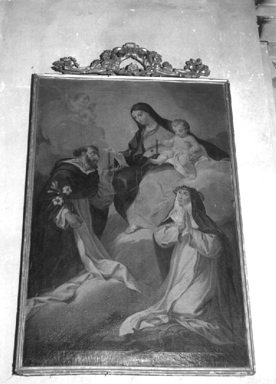 - NOTIZIE STORICO CRITICHE Attribuito dal Bertini(1979,in bibliografia)ad Antonio Bresciani per ragioni di omogeneità tematica e stilistica,si tratta di un dipinto nato come stendardo processionale in cui il Bresciani unisce due tematiche iconografiche assai care al duca:la Madonna del Rosario,e la beata Stefana.Pur di qualità inferiore all'altro suo stendardo dipinto presente in S.Liborio(cfr.scheda n.00142870)avente come soggetto la Madonna con San Rocco,ne ripropone la struttura piramidale e le tipologie fisionomiche.Opera di stile "devozionale" e di ispirazione accademica,è interessante tuttavia a dimostrare come il Bresciani,pur trattando un soggetto analogo a quello delle tempere su muro,riesca,nella tecnica ad olio su tela,a produrre,pur nei limiti sopraindicati,un linguaggio molto più sciolto ed una composizione più armoniosa,effetti coloristici più vivaci e brillanti