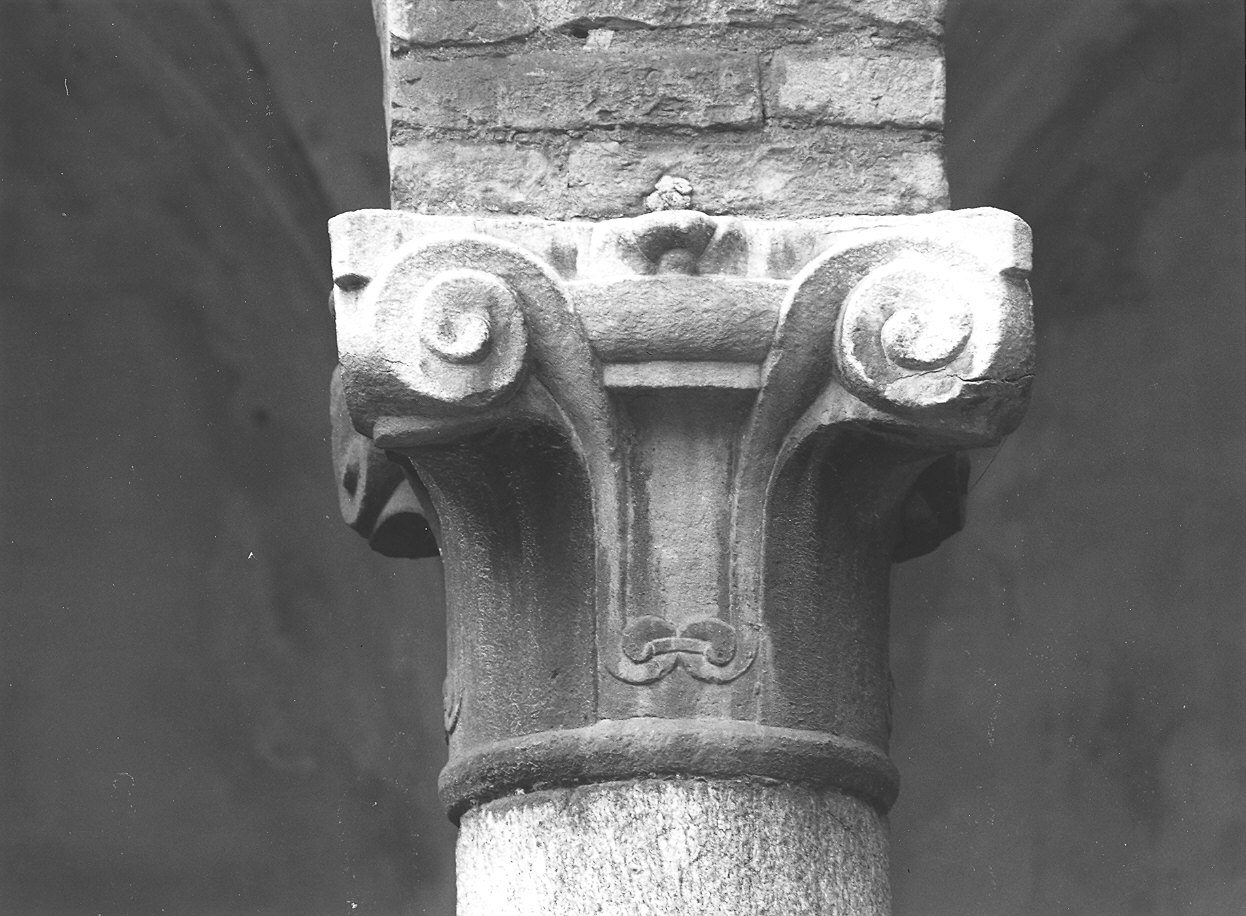 I capitelli, scolpiti a fogliame, mostrano tra loro leggere differenze: 1) abaco a croce con fiore centrale a tre petali. I caulicoli si riuniscono nella parte inferiore in un'unica fascia; 2) abaco a croce molto rovinato, fiore centrale, i caulicoli si riuniscono in un piccolo nodo; 3) abaco a croce, fiore centrale, i caulicoli si riuniscono in un nodo più evidente del precedente; 4) capitello di colonna polistila agli angoli