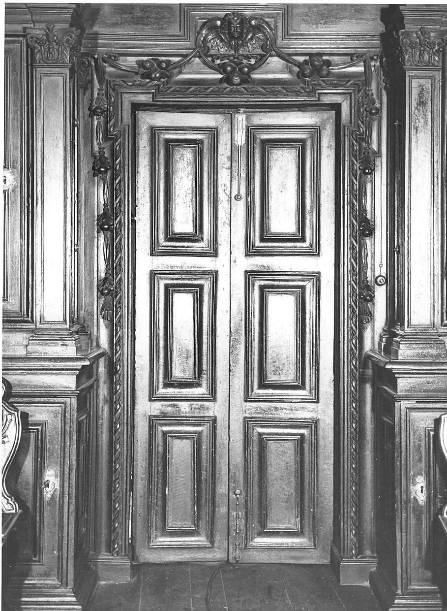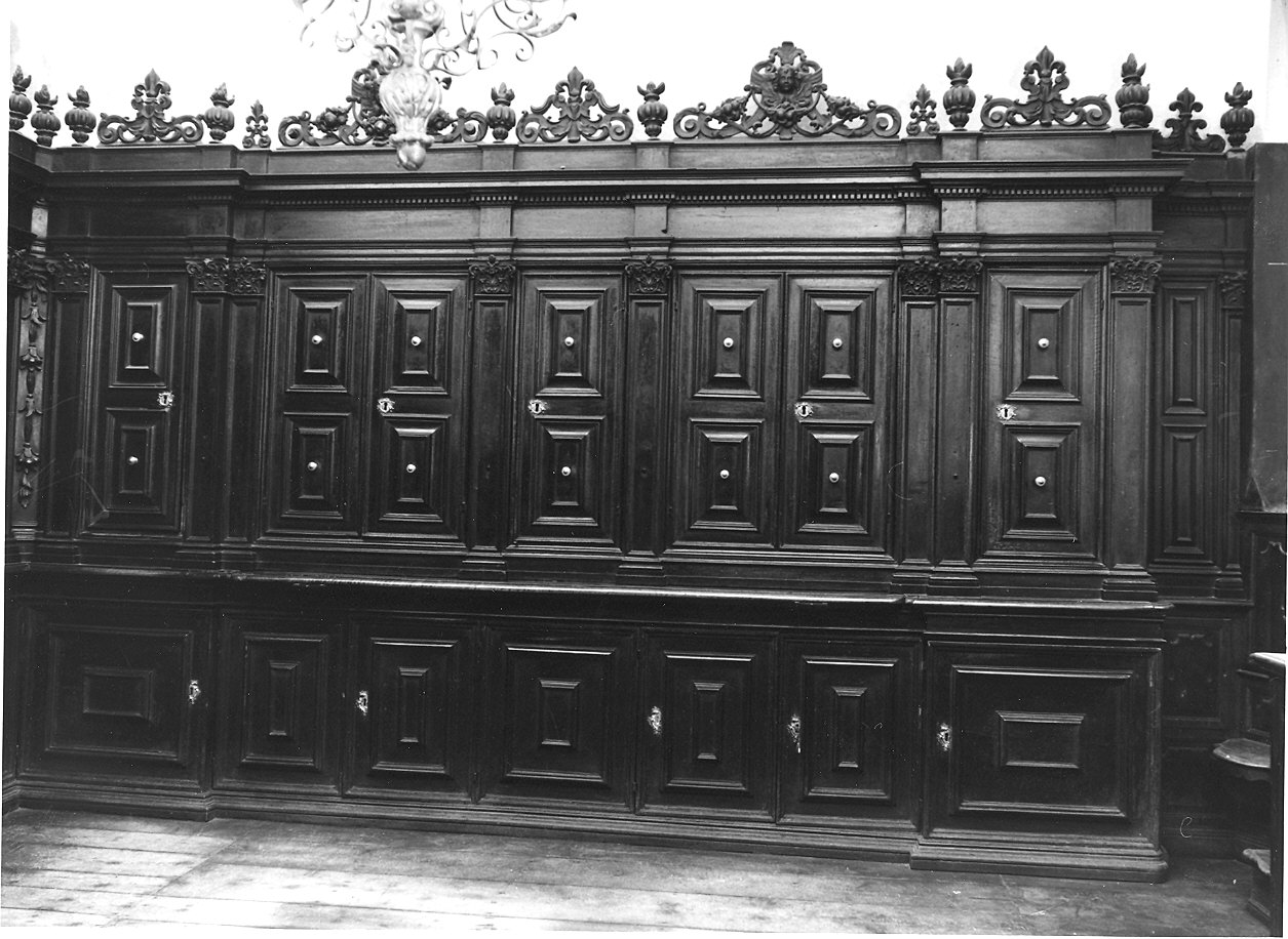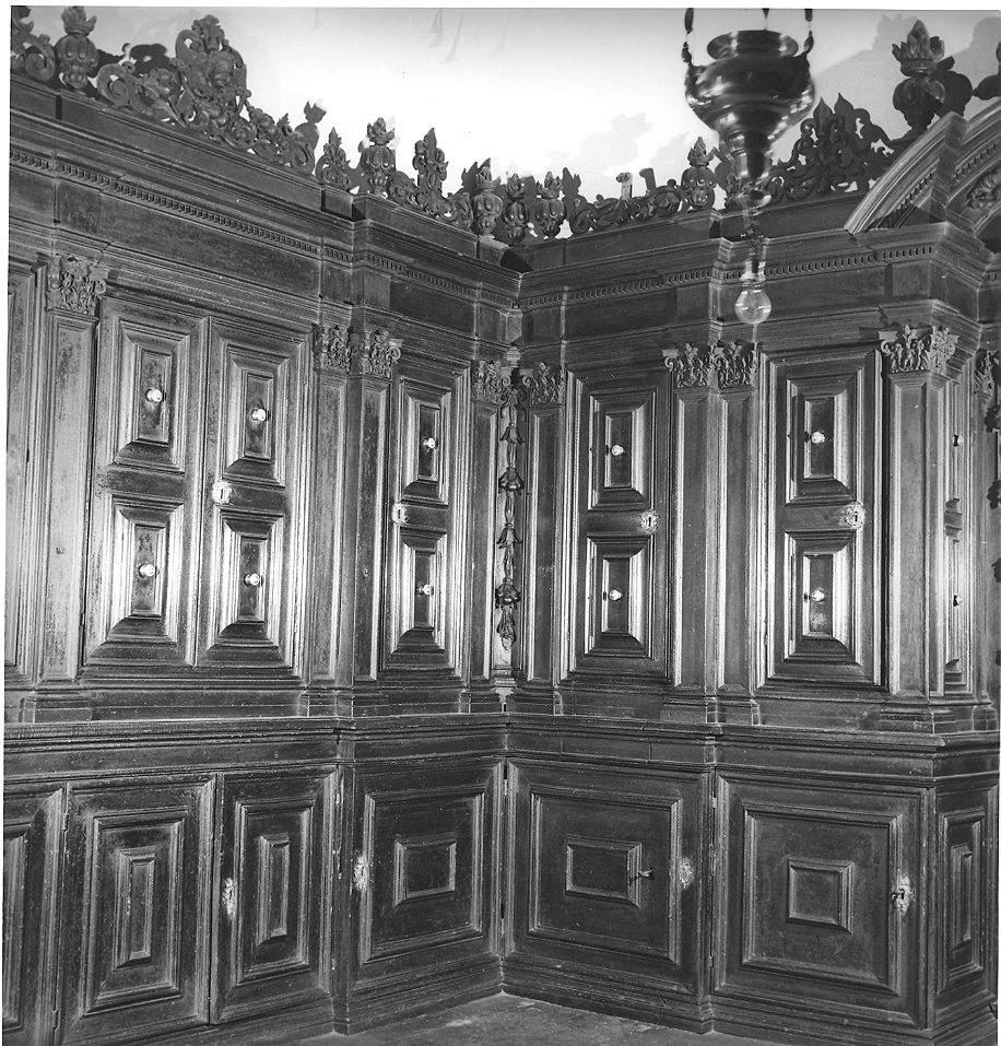 - NOTIZIE STORICO CRITICHE Complesso di imponente presenza e notevole ricchezza di intagli. Per la rigidezza delle sue linee e per l'impostazione architettonica si ricollega alla tradizione del mobile parmense del Seicento. Avvicinato da Cirillo e Godi ai mobili della sagrestia della parrocchiale di Fontanellato, databile alla fine del secolo XVII. La cimasa è un'aggiunta molto posteriore datata 1758